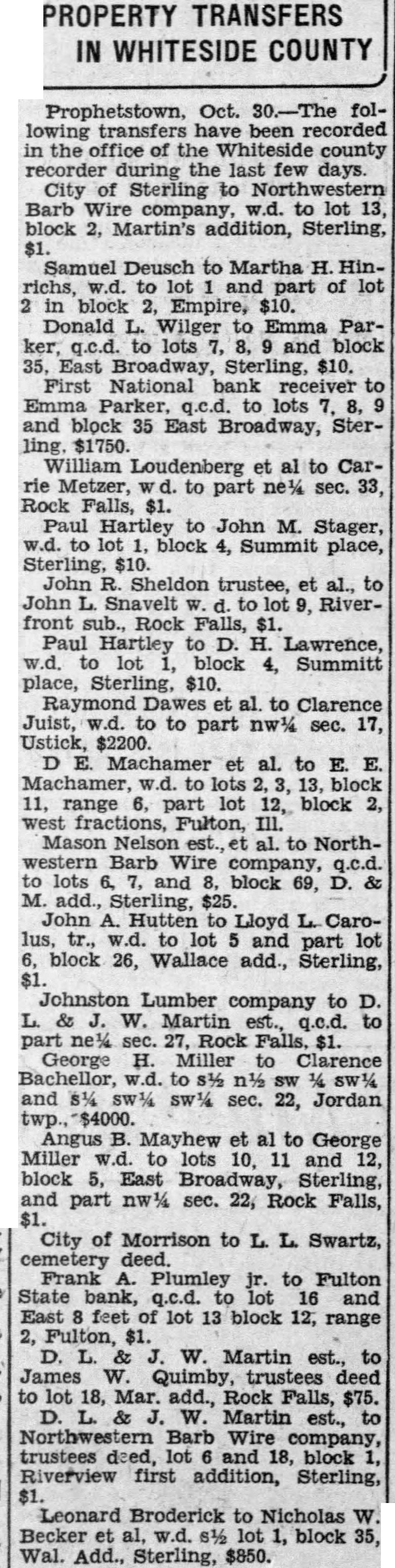 PROPERTY TRANSFERS IN WHITESIDE COUNTY Prophetstown, Oct. following been of the Whiteside county recorder the last few City Sterling to Northwestern Barb company, to block Martin's addition, Sterling, Samuel Deusch to Martha and part of block Empire, Donald Wilger to Emma ker. to and block East $10. First National bank receiver Parker, to lots and block 35 East Broadway, William Loudenberg to CarMetzer, to part sec. Rock Falls, Paul Hartley to John M. Stager, block Summit place, Sterling, John Sheldon trustee, et John Snavelt to front sub., Rock Falls, Paul Hartley to Lawrence, lot block Summitt place, Sterling, $10. Raymond Dawes to Clarence Juist, to part $2200. Machamer al. to Machamer, range part lot block fractions, Fulton, Mason Nelson to Barb lots block John Hutten Lloyd lus, to and part block 26, Wallace add., Johnston Lumber company to Martin Rock Falls. George Miller Clarence Bachellor, and sec. Jordan Angus Mayhew al to George Miller block East Broadway, Sterling, part sec. Rock Falls, City of Morrison to Swartz, cemetery deed. Plumley to Fulton State bank, and East feet lot block Fulton, Martin James Quimby, trustees deed lot Mar. add., Rock Martin est., Barb Wire and Riverview first addition, Sterling, Leonard Broderick to Nicholas Becker Add., Sterling,