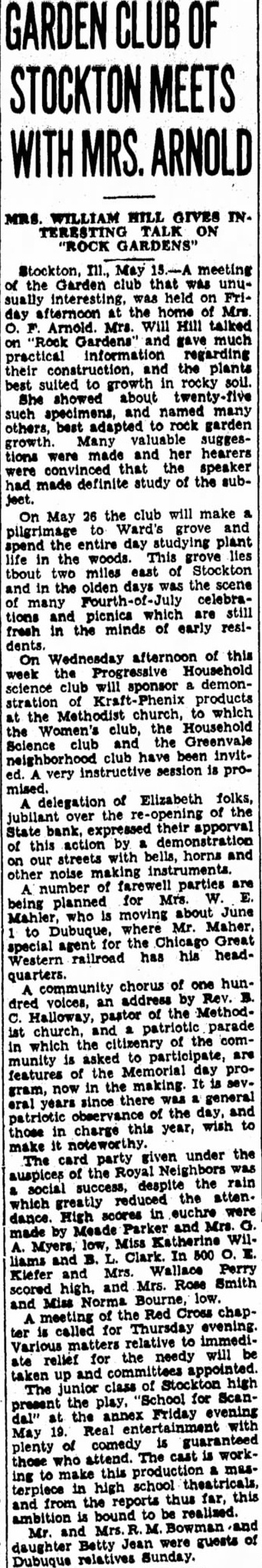 ARNOLD MRS. WILLIAM HILL GIVES INTERESTING TALK ON "ROCK GARDENS" Stockton, May meeting of the Garden club that was unusually interesting. was held on Friday afternoon at the home of Mrs. Arnold. Mrs. will Hill talked on "Rock Gardens" and gave much practical information regarding and the plants their suited to growth in rocky soil. best She showed about such specimens, and named many best adapted to rock garden others, Many valuable suggesgrowth. tions were made and her hearers convinced that the speaker were had made definite study of the subthe club will make On May 26 to Ward's grove and pilgrimage the entire day studying plant spend woods. This grove lies life in the miles east of Stockton tbout two days was the scene and in the olden celebraof many tions and pienica which are still fresh in the minds of early residents. On Wednesday afternoon of this week the Progressive Household will demonscience club sponsor stration of products which Methodist church, to at the the Household the Women's club, and the Greenvale Science club club have been invitneighborhood instructive session proed. very mised. of Elizabeth folks, delegation of the the re-opening jubilant over expressed their apporval State bank, demonstration of this action by with bells, horns and our streets other on noise making instruments. number of farewell parties W. for Mrs. being Mahler, planned who is moving about Maher. June where Mr. to Dubuque, Chicago Great for the special agent has his headWestern railroad quarters. of one huncommunity chorus address by Rev. dred voices, an of the MethodHalloway, pastor patriotic parade ist church, and of the comwhich the citizenry munity in asked to participate, are features of the Memorial It day is pro- sevnow in the gram, there was general eral years since of the day, and patriotic wish to charge this year, those in make it noteworthy. under the card party given The Neighbors was of the Royal auspices the rain despite social success, the atten. reduced which greatly in euchre were dance. made by High Meade Parker Katherine and Mrs. Willow, Miss Myers, Clark. In 500 liams and Wallace Perry and Mrs. Mrs. Rose Smith scored high, and and Miss Norma Bourne, low. meeting of the Red Cross chapThursday evening. called for relative to immediVarious matters needy will be relief for the ate appointed. taken up and of high The junior class for Scanthe present dal" at the annex Friday evening May 19. Real entertainment guaranteed with of comedy is plenty those who attend. The cast is working to make this production theatricals, mashigh school in thus far, this and from the reports is bound to be realized. Bowman and Mr. and guests of Jean were daughter Betty relatives Sunday. Dubuque
