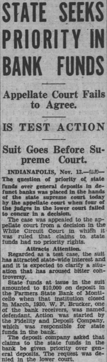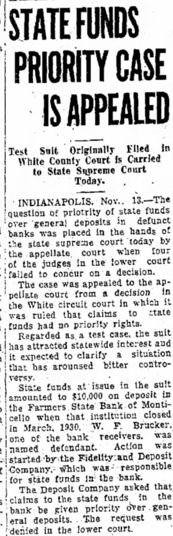 DEPOSITORS ASK DELAY IN NAMING BANK RECEIVER Seek Sufficient Time To Study Prospects of Reorganization. 150 ATTEND MEETING. A petition praying the White circuit court to hold in abeyance the appointment of a receiver for the Farmers State Bank for a time while the depositors considered the advisability of perfecting a reórgenization was signed by a large number of depositors of the bank, who held meeting in the basement of the library Friday evening. If it becomes necessary to appoint receiver, the petition continued, then the depositors would like to have a voice in selecting the person to be designated. T. J. Hanna, local attorney, a depositor and stockholder in the bank, acted as temporary chairman of the meeting by request. Dr. A. B. Cray was selected permanent chairman, and John A. Rothrock secretary. Captain William Guthrie made talk, in which he urged the depositors to stand together for the benefit of all. He said that he was not familiar with the details of the bank, and had no immediate solution to offer for the problem, but suggested that the proper course was for the depositors to study the situation carefully, and work out the plan which would be best both for themselves and the community at large. Charles Johnson said be would like to hear a report on the condition of the bank. Hanna replied that Mr. Fraser, the deputy state bank commissioner in charge of the local institution, completed his report Friday and had forwarded it to the department at Indianapolis. As soon as it had been checked over and o. k.ed there, Mr. Hanna stated, it would be available for public inspection, and he suggested that another meeting be held next week when Mr. Fraser could appear before the depositors and tell them what he knew regarding the bank's condition. Petition Presented At this point the petition was presented and read. Sam Young, formerly receiver for the National Bank. suggested that a definite time be set for the postponement of action by the court. He said that too much delay might give some one a chance to "get out from under.' After considerable discussion, a period of days was decided upon, which would bring the matter up for definite action by the court on March 3 1st. By that time, it is thought that the desirability and practicability of reorganization can be canvassed. Dr. Cray, in speaking at the meeting, pointed out that the interests of the depositors were identical. All of them, he said, were interested in getting 100 cents on every dollar they had put in the bank, if there was any way to work out the problem. He thought that a quick liquidation of the assets might result in material loses. His talk appeared to be well received. None of the officers of the bank attended the meeting, which was more or less in the nature of a preliminary to the business which is expected to come later. A committee probably will be appointed by the depositors to represent them in the future, and the probabilities are that another meeting will be held early next week, at which time Mr. Fraser will make a report. The interest of the depositors is indicated by the fact that 150 out of about 250 depositors of the bank were present last evening.