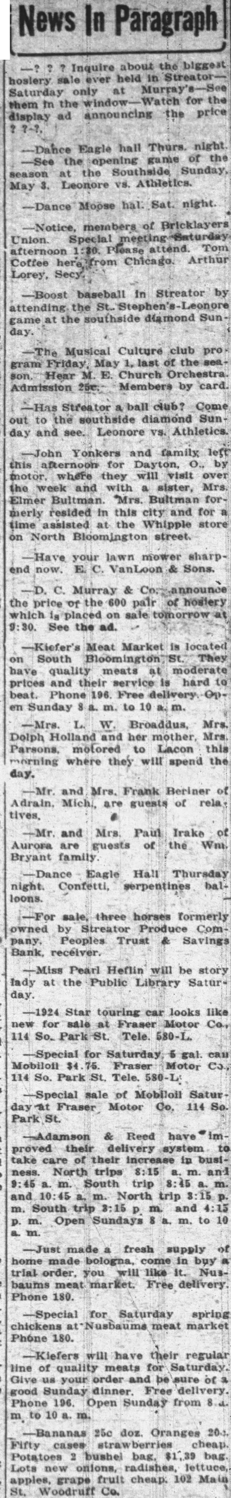 News In Paragraph about the biggest Inquire ever held hoslery Saturday only at for the them the announcing the price display ad Eagle hall Thurs. night game of the the opening Southside Sunday, the May Leonore Athletics. Moose members of Union. Special Tom afternoon Arthur Coffee Lorey, baseball in Streator by attending the the southside diamond game day. Musical Culture club May last of gram Hear E. Church Admission Members by card. Streator ball Come out the southside diamond Sun day and Leonore Yonkers and family this afternoon for Dayton, by motor where they will visit over the week and with sister, Mrs. Elmer Bultman. Mrs. Bultman merly resided in this city and for time assisted the Whipple store on North Bloomington street. your lawn mower sharpend now. E. VanLoon Sons. Murray the price of the 600 pair hosiery which placed on sale See the ad. -Kiefer's Meat Market located on South They have quality meats moderate prices and their service hard beat. Phone 196. Free en Sunday m. to 10 -Mrs. W. Broaddus, Mrs. Dolph Holland and her mother, Mrs. Parsons, motored to Lacon this morning where they will spend the day. and Mrs. Frank Beriner of and Mrs. Paul Irake of Aurora are guests of the Wm. Bryant family Eagle Hall Thursday night. Confetti, serpentines loons. sale, three horses formerly owned by Streator Produce ComPeoples Trust Bank, receiver. Pearl Heflin will be story lady at the Public Library Saturday. Star touring looks like new for sale at Fraser Motor Co, 114 Tele. -Special for Saturday, gal can Mobiloil 75. Fraser Motor 114 So. Park Tele. -Special sale of Mobiloil Satur Fraser Motor Park -Adamson Reed have proved their delivery system take care of their increase in business. North trips 8:15 and m. South trip and North trip South trip and m. Open Sundays m. to made fresh supply home made bologna, come in buy you will like Nusbaums meat market. Free delivery Phone 180. -Special Saturday spring chickens meat market Phone 180. -Kiefers will have their regular line of quality meats for us your order and be sure of good Sunday dinner. Free delivery. Phone 196. Open Sunday from 25c doz. Oranges 20.1. Fifty cases Potatoes bushel bag, bag. Lots new onions, radishes, lettuce, apples, grape fruit cheap. 102 Main Woodruff Co.