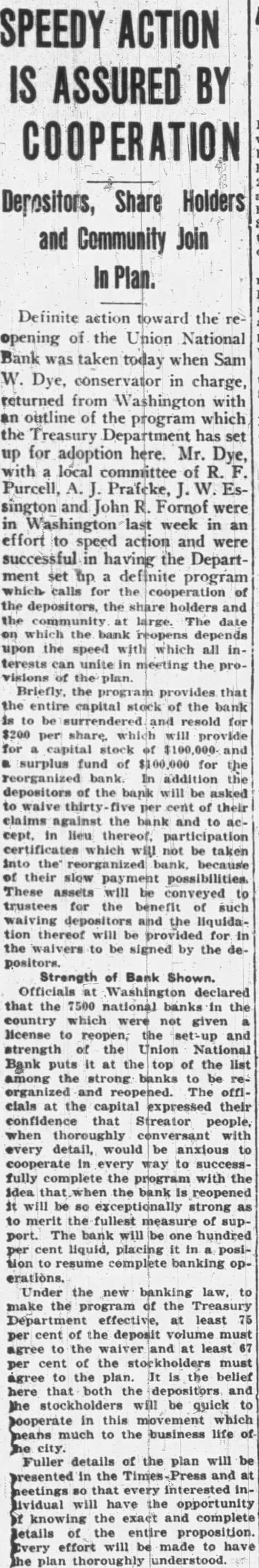 SPEEDY ACTION IS ASSURED BY COOPERATION Depositors, Share and Join Community Definite action toward the opening of the Union National Bank taken today when Sam Dye, conservator in charge, returned from Washington with an outline of the program which the Treasury has set up for adoption here. Mr. Dye, with local committee of Purcell, Prafeke, sington and John Fornof were in Washington last week in an effort to speed action and were successful in having the Department set up program which calls for the cooperation of the depositors, the share holders and large. The date which the bank reopens depends upon the speed which all terests can unite in meeting the visions plan. Briefly. the program that entire capital stock of the bank surrendered and resold for $200 per share, which provide capital stock and surplus fund of for reorganized addition the depositors the bank will be asked their claims against the bank and in lieu participation certificates which not be taken Into the reorganized because their slow These assets will be conveyed trustees for benefit of such depositors and the liquidation thereof will for the waivers to be signed by the deStrength Bank Shown. Officials Washington declared that the 7500 national banks the country which were not given license to reopen; the and strength of the Union National Bank puts at of the list among the strong banks be organized reopened. The officials the capital expressed their confidence that Streator people, when thoroughly with every detail, would anxious cooperate in every way to successfully complete the program with the Idea the bank reopened will exceptionally strong merit the fullest measure of support. The bank will be one hundred per cent liquid, placing posito resume complete banking erations. Under the new banking law, make the program of the effective, at least cent of the deposit volume must agree to the waiver and least cent of the must the plan. It the belief that both the depositors and stockholders will be quick pooperate in this movement which much to the business life Fuller details of the plan will presented in the and that every interested inwill have opportunity knowing the exact and complete the entire proposition. effort will be made to have plan thoroughly