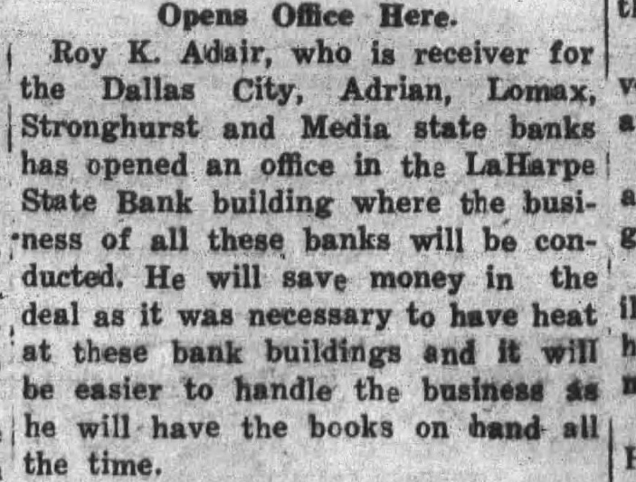 Opens Office Here. Roy K. Adair, who is receiver for Dallas City, Adrian, Lomax, Stronghurst and Media state banks opened an office in the LaHarpe State Bank building where the busi*ness of all these banks will be conducted. He will save money in the ill deal as it was necessary to have heat these bank buildings and it will be easier to handle the business as he will have the books on hand all time.