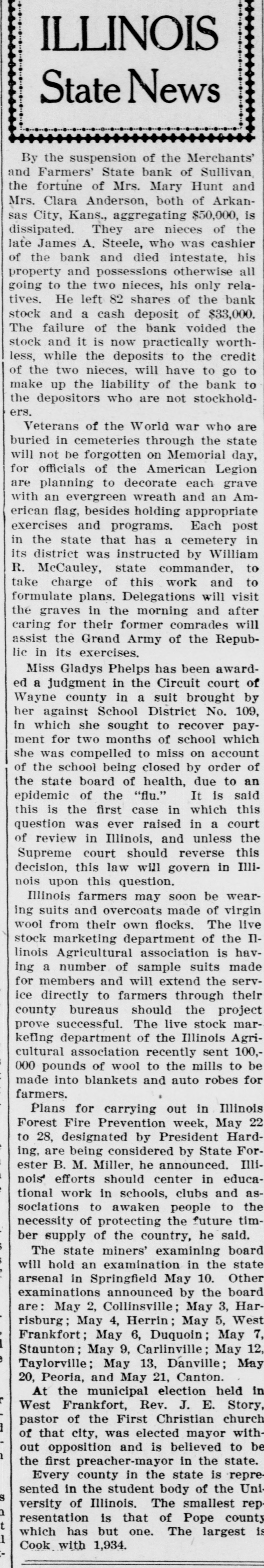 ILLINOIS State News By the suspension of the Merchants' and Farmers' State bank of Sullivan, the fortune of Mrs. Mary Hunt and Mrs. Clara Anderson, both of Arkansas City, Kans., aggregating $50,000. is dissipated. They are nieces of the late James A. Steele, who was cashier of the bank and died intestate, his property and possessions otherwise all going to the two nieces, his only relatives. He left 82 shares of the bank stock and a cash deposit of $33,000. The failure of the bank voided the stock and it is now practically worthless, while the deposits to the credit of the two nieces, will have to go to make up the liability of the bank to the depositors who are not stockholders. Veterans of the World war who are buried in cemeteries through the state will not be forgotten on Memorial day, for officials of the American Legion are planning to decorate each grave with an evergreen wreath and an American flag, besides holding appropriate exercises and programs. Each post in the state that has a cemetery in its district was instructed by William R. McCauley, state commander, to take charge of this work and to formulate plans. Delegations will visit the graves in the morning and after caring for their former comrades will assist the Grand Army of the Republic in its exercises. Miss Gladys Phelps has been awarded a judgment in the Circuit court of Wayne county in a suit brought by her against School District No. 109, in which she sought to recover payment for two months of school which she was compelled to miss on account of the school being closed by order of the state board of health, due to an epidemic of the "flu." It is said this is the first case in which this question was ever raised in a court of review in Illinois, and unless the Supreme court should reverse this decision, this law will govern in Illinois upon this question. Illinois farmers may soon be wearing suits and overcoats made of virgin wool from their own flocks. The live stock marketing department of the Illinois Agricultural association is having a number of sample suits made for members and will extend the service directly to farmers through their county bureaus should the project prove successful. The live stock marketing department of the Illinois Agricultural association recently sent 100,000 pounds of wool to the mills to be made into blankets and auto robes for farmers. Plans for carrying out in Illinois Forest Fire Prevention week, May 22 to 28, designated by President Harding, are being considered by State Forester B. M. Miller, he announced. Illinois' efforts should center in educational work in schools, clubs and associations to awaken people to the necessity of protecting the future timber supply of the country, he said. The state miners' examining board will hold an examination in the state arsenal in Springfield May 10. Other examinations announced by the board are: May 2, Collinsville; May 3, Harrisburg; May 4, Herrin; May 5, West Frankfort; May 6, Duquoin; May 7. i Staunton; May 9, Carlinville; May 12, e Taylorville; May 13, Danville; May 20, Peoria, and May 21, Canton. At the municipal election held in West Frankfort, Rev. J. E. Story, pastor of the First Christian church I of that city, was elected mayor without opposition and is believed to be n the first preacher-mayor in the state. Every county in the state is represented in the student body of the Uni S versity of Illinois, The smallest repa resentation is that of Pope county t which has but one. The largest is 1 Cook with 1,934.