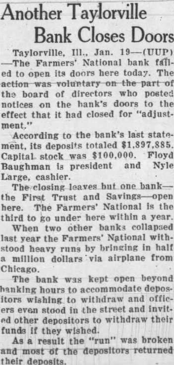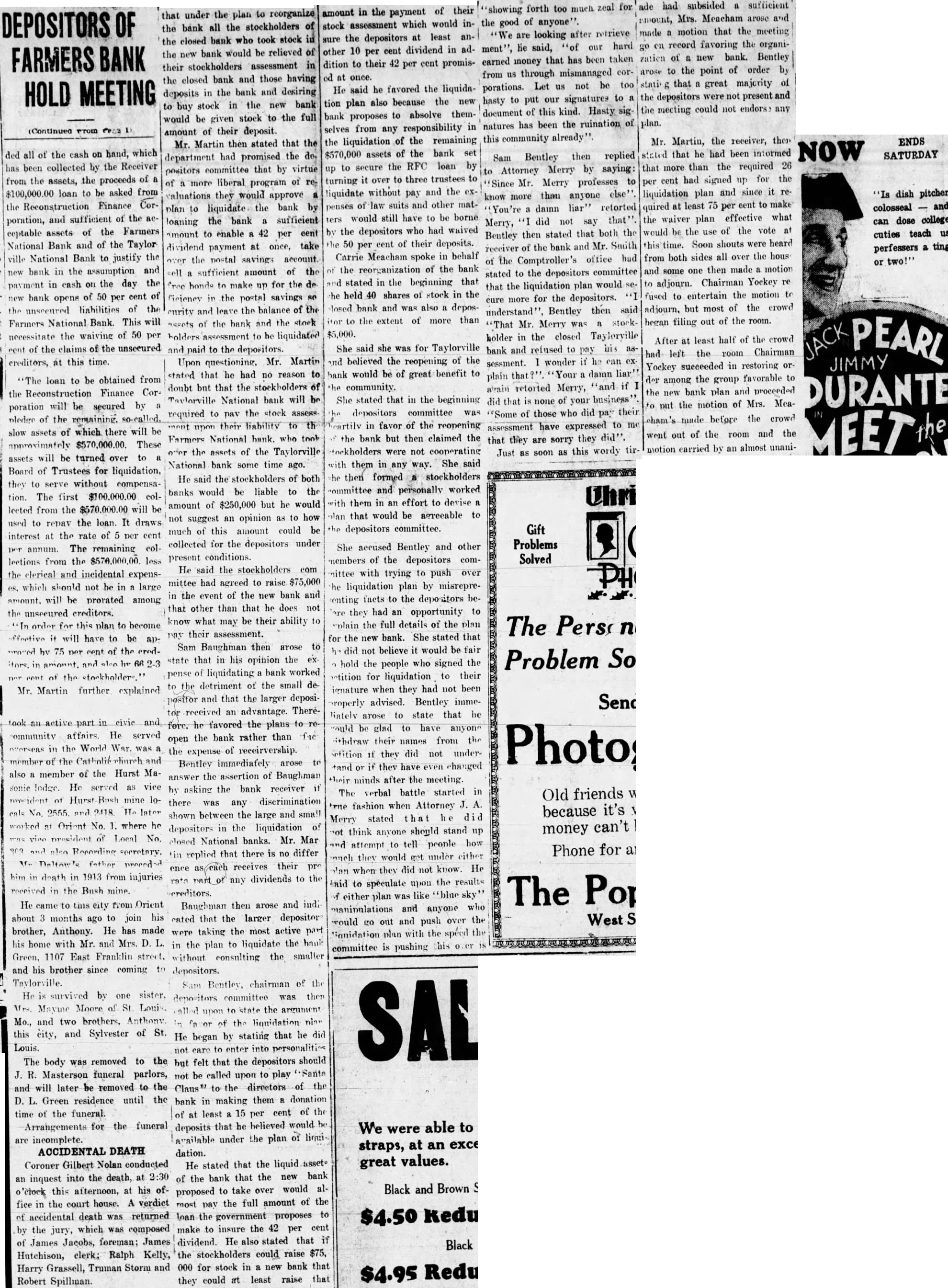 Sam Bentley then replied to Attorney Merry by saying: 'Since Mr. Merry professes to know more than anyone else". You're a damn liar" retorted Merry, "I did not say that' Bentley then stated that both the receiver of the bank and Mr. Smith of the Comptroller's office had stated to the depositors committee that the liquidation plan would secure more for the depositors. "I understand Bentley then said That Mr. Merry was a stock holder in the closed Tayloryille bank and refused to pay his assessment. I wonder if he can ex plain that Your a damn liar" atrain retorted Merry, "and if I did that is none of your business' Some of those who did pay their assessment have expressed to me that they are sorry they did". Just as soon as this wordy tir- ade had subsided a sufficient amount, Mrs. Meacham arose and made a motion that the meeting go on record favoring the organizatien of a new bank. Bentley arose to the point of order by stati that a great majority of the depositors were not present and the meeting could not endors any plan.