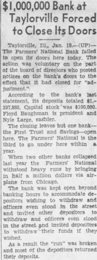 DEPOSITORS OF FARMERS BANK HOLD MEETING ded all of the cash on hand, which has been collected by the Receiver from the assets, the proceeds of a $100,000.00 loan to be asked from the Reconstruction Finance Corporation, and sufficient of the acceptable assets of the Farmers National Bank and of the Taylor ville National Bank to justify the new bank in the assumption and payment in cash on the day the new bank opens of 50 per cent of the unsecured liabilities of the Farmers National Bank. This will necessitate the waiving of 50 per cent of the claims of the unsecured creditors, at this time.