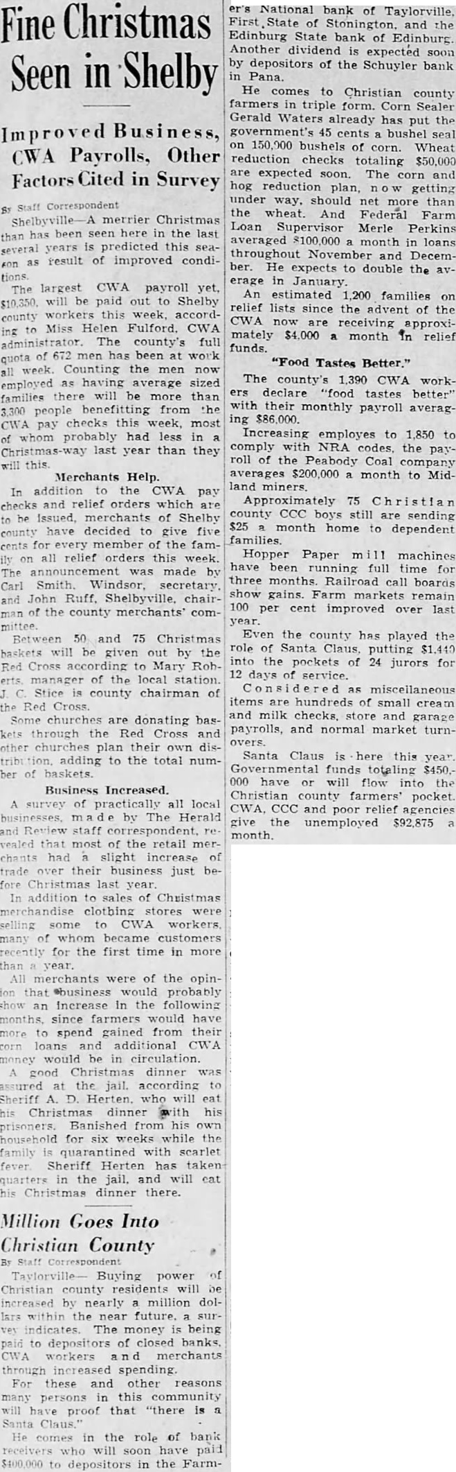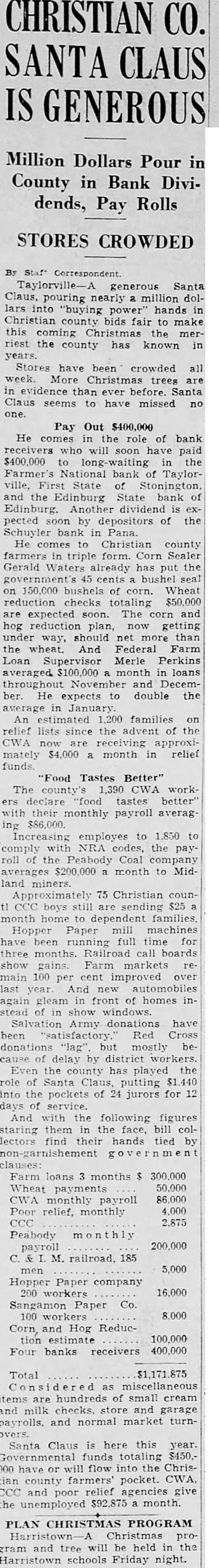 The body was removed to the J. R. Masterson funeral parlors, and will later be removed to the D. L. Green residence until the time of the funeral. Arrangements for the funeral are incomplete. ACCIDENTAL DEATH Coroner Gilbert Nolan conducted an inquest into the death, at 2:30 o'clock this afternoon, at his office in the court house. A verdict of accidental death was returned by the jury, which was composed of James Jacobs, foreman; James Hutchison, clerk; Ralph Kelly, Harry Grassell, Truman Storm and Robert Spillman. that under the plan to reorganize the bank all the stockholders of the closed bank who took stock in the new bank would be relieved of their stockholders assessment in the closed bank and those having deposits in the bank and desiring to buy stock in the new bank would be given stock to the full amount of their deposit. Mr. Martin then stated that the department had promised the depositors committee that by virtue of a more liberal program of revaluations they would approve a plan to liquidate the bank by loaning the bank a sufficient amount to enable a 42 per cent dividend payment at once, take over the postal savings account. sell a sufficient amount of the free honds to make up for the de ficiency in the postal savings so curity and leave the balance of the assets of the bank and the stock bolders assessment to be liquidated and paid to the depositors. Upon questioning. Mr. Martin stated that he had no reason to doubt but that the stockholders of Tavlorville National bank will be required to pay the stock assess. ment upon their liability to th Farmers National bank. who took over the assets of the Taylorville National bank some time ago. He said the stockholders of both banks would be liable to the amount of $250,000 but he would not suggest an opinion as to how much of this amount could be collected for the depositors under present conditions. He said the stockholders com mittee had agreed to raise $75,000 in the event of the new bank and that other than that he does not know what may be their ability to pay their assessment. Sam Baughman then arose to state that in his opinion the ex pense of liquidating bank worked to the detriment of the small depositor and that the larger deposifor received an advantage. Therefore. he favored the plans to reopen the bank rather than fac the expense of receirvership. Bentley immediately arose to answer the assertion of Baughman by asking the bank receiver if there was any discrimination shown between the large and small depositors in the liquidation of closed National banks. Mr. Mar tin replied that there is no differ ence as cach receives their pro rate part of any dividends to the Baughman then arose and indi cated that the larger depositor were taking the most active part in the plan to liquidate the hank consulting the smaller without depositors.