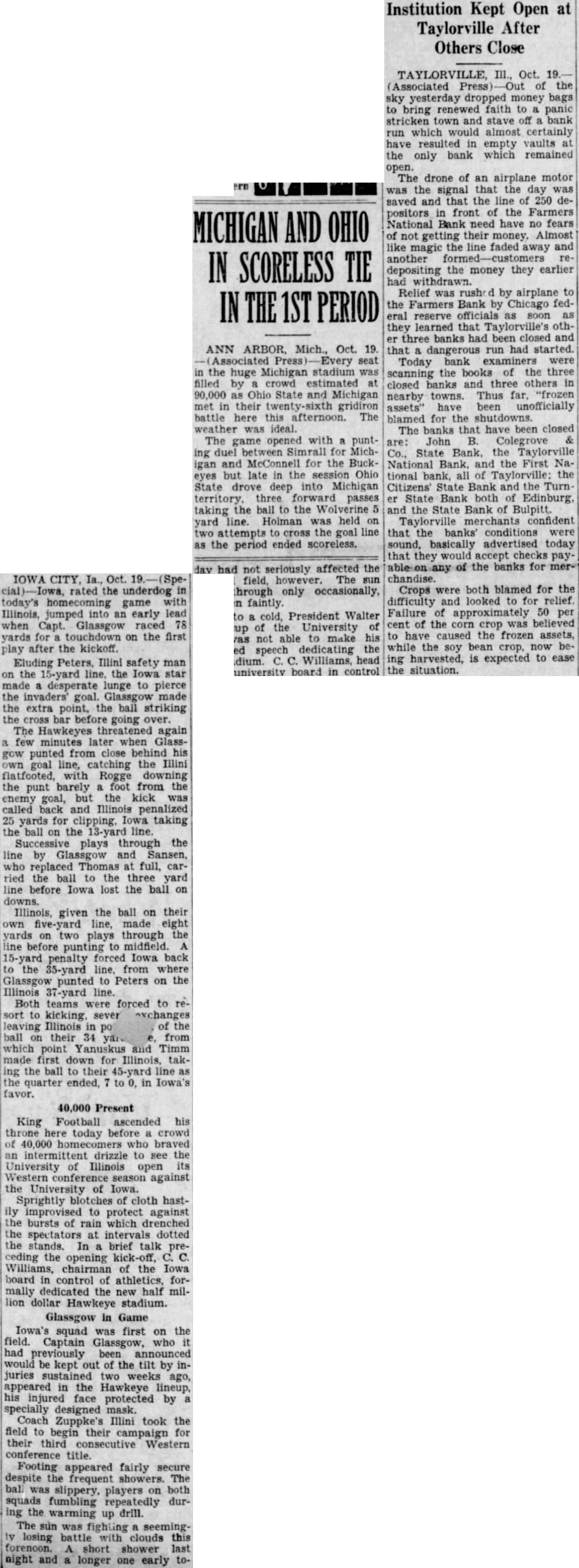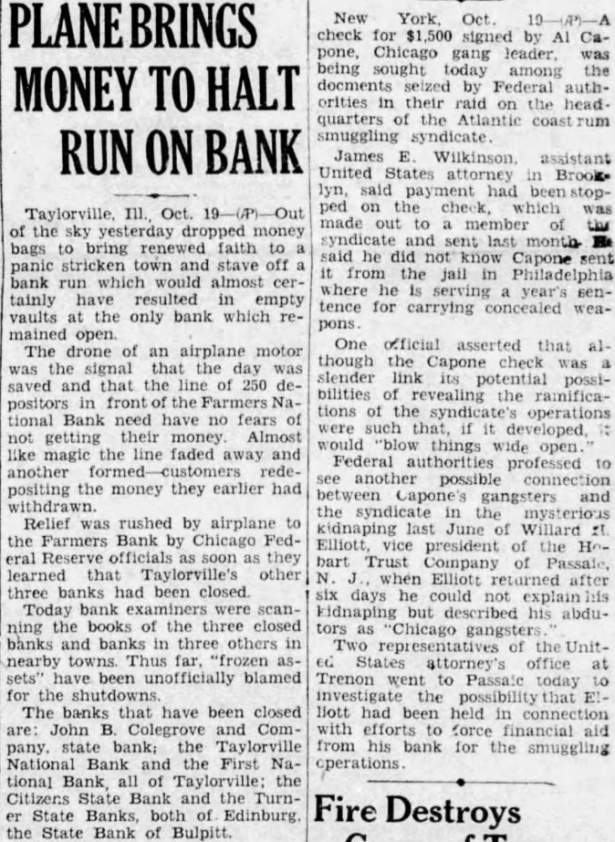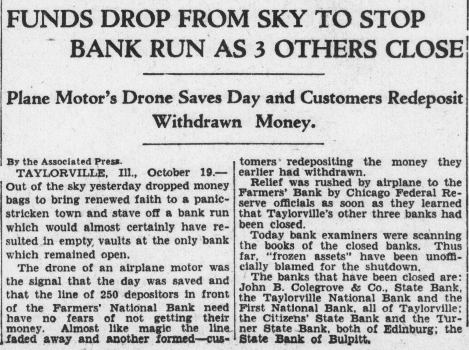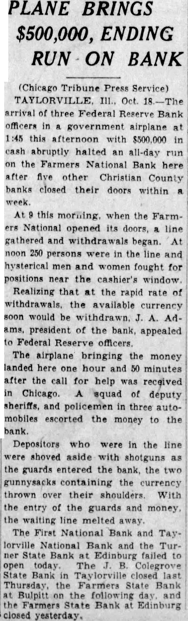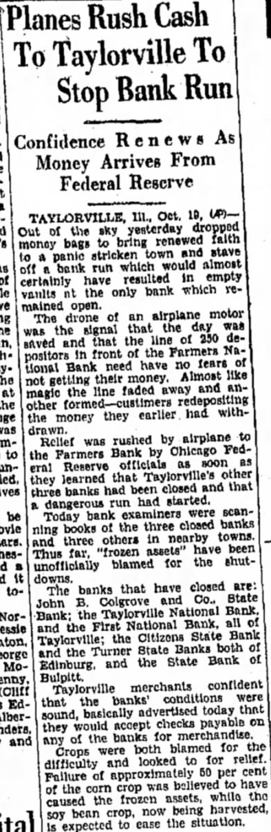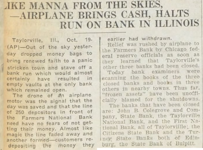 Oct. (Associated of the sky yesterday dropped money bags to bring renewed faith to panic stricken town and stave off bank which would almost certainly have resulted in empty vaults the only bank which remained open. The drone of an airplane motor the signal that the day was saved and that the line of 250 depositors front of the Farmers National Bank need have fears not getting their money. Almost like magic line faded away and another depositing the money they earlier withdrawn. Relief was by airplane the Farmers Bank by Chicago federal reserve officials as soon they learned that Taylorville's oththree banks had been closed and that dangerous run had started. Today bank were the books of the three scanning closed banks and three others towns. Thus "frozen nearby assets" have been unofficially blamed for the shutdowns. The banks that have been closed are: John B. Colegrove State Bank, the Taylorville National Bank, and the First tional all of Taylorville: the Citizens' State Bank and the TurnState Bank both of Edinburg, and the State Bank of Bulpitt. merchants confident that the banks' conditions were sound, basically advertised today that they checks paythe banks merchandise. both blamed for the Crops were difficulty and looked to for relief. Failure approximately 50 per cent of the corn was believed crop have caused the frozen assets, while the bean crop, now beharvested, is expected to ease the situation.