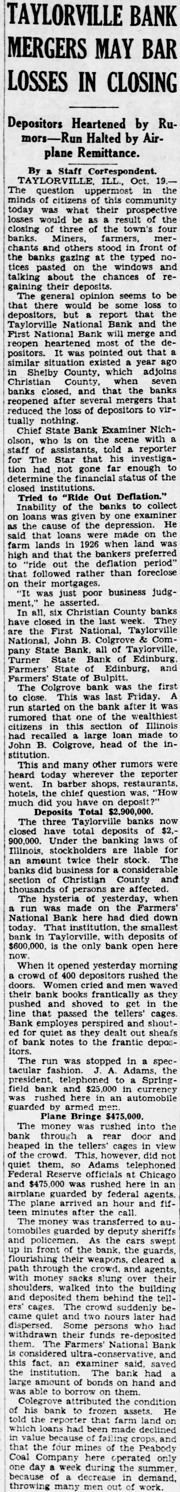 By Staff question minds this today what their prospective losses be of the closing three of the town's four banks. Miners, chants and others stood in front of the banks gazing the typed notices pasted and talking about of regaining their deposits. general opinion seems to be would be some loss depositors, but report that the Taylorville National Bank and the First National Bank merge and reopen heartened most of depositors. was pointed that similar year ago Shelby County, which adjoins Christian County, seven banks and that the banks reopened that reduced the loss of depositors to virtually Chief State Bank Examiner Nicholson, on the scene staff told reporter for The Star his investigation had not far the status of the closed Tried "Ride Out Deflation." Inability the banks collect examiner the loans were made the said that lands 1926 when land farm high that the bankers preferred out the deflation period" that followed rather than foreclose on their mortgages. just business judghe asserted. all. six Christian County banks closed They First all pany Turner Bank Edinburg. Farmers' State State The the first to This was last Friday. run started the after was rumored the wealthiest citizens of Illinois loan John Colgrove, head of the stitution. This and many other rumors were heard today wherever the reporter went. In barber hotels, the chief question much did have Deposits Total $2,900,000. The three Taylorville banks closed deposits Under Illinois, are liable for an amount twice stock. banks section of Christian County The of when Farmers' National here had died down today. $600,000, the bank open here When opened yesterday morning crowd 400 depositors rushed the doors. cried their bank books they pushed shoved line that passed the tellers' cages. Bank employes and shoutfor quiet they dealt out sheafs bank notes to the frantic deposThe was stopped in spectacular Adams, telephoned Springbank in an automobile The money rushed through and heaped in tellers' view of crowd. This, quiet them, Adams telephoned Federal officials Chicago rushed here airplane guarded by federal agents. The plane arrived hour and minutes after money was transferred guarded by deputy sheriffs policemen. the swept front the bank, guards, crowd. and their walked the building and the cages. The quiet two hours dispersed. withdrawn funds them. The Bank and this saved the The bank amount of bonds hand and borrow them. Colegrove attributed the condition bank to frozen assets. He that farm declined that the four of the Peabody Coal only one day during the because of in demand, throwing many men out work.