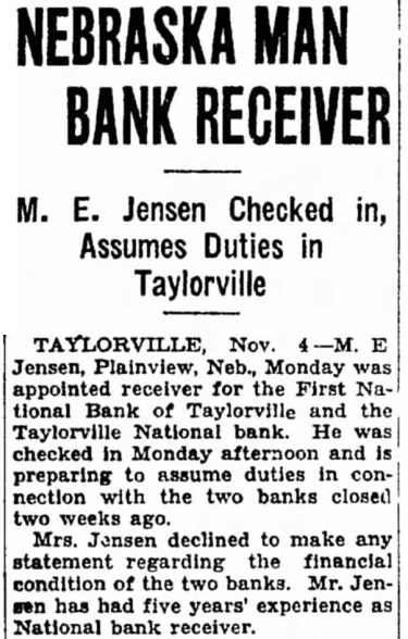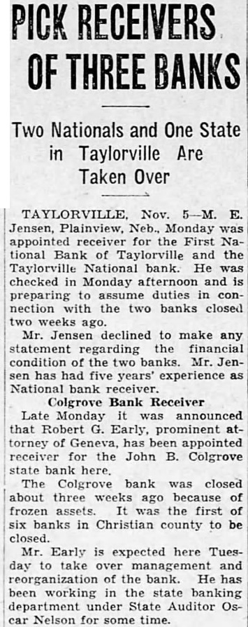 Nov. Jensen, Plainview, Neb., Monday was appointed receiver for the First tional Bank of Taylorville and the Taylorville National bank. He was checked in Monday afternoon and preparing to assume duties connection the two banks closed two weeks ago. Mr. Jensen declined to make any statement regarding the financial condition the two banks. Mr. Jenhas had five years' experience as National bank receiver. Colgrove Bank Receiver Late Monday was announced that Robert G. Early, prominent torney of Geneva, has been appointed receiver the John B. Colgrove state bank here. The Colgrove bank was closed about three weeks ago because of frozen assets. was the first of six banks in Christian county to be closed. Mr. Early is expected here Tuesday to take over management and reorganization of the bank. He has been the state banking department under State Auditor Oscar Nelson for some time.