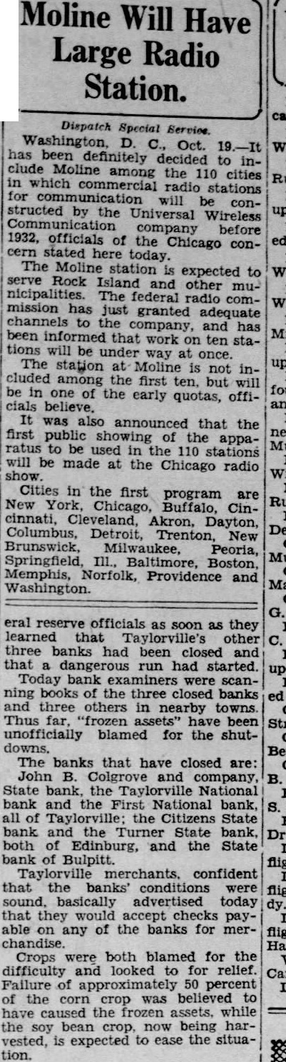 Dispatch Special Service Washington, D. C., Oct. 19.-It has been definitely decided to include Moline among the 110 cities in which commercial radio stations for communication will be constructed by the Universal Wireless Communication company before 1932, officials of the Chicago concern stated here today. The Moline station is expected to serve Rock Island and other municipalities. The federal radio commission has just granted adequate channels to the company, and has been informed that work on ten stations will be under way at once. The station at Moline is not included among the first ten, but will be in one of the early quotas, officials believe. It was also announced that the first public showing of the apparatus to be used in the 110 stations will be made at the Chicago radio show. Cities in the first program are New York, Chicago, Buffalo, Cincinnati, Cleveland, Akron, Dayton, Columbus, Detroit, Trenton, New Brunswick, Milwaukee, Peoria, Springfield, Ill., Baltimore, Boston, Memphis, Norfolk, Providence and Washington. eral reserve officials as soon as they learned that Taylorville's other C. three banks had been closed and that a dangerous run had started. Today bank examiners were scanning books of the three closed banks and three others in nearby towns. Thus far, "frozen assets" have been unofficially blamed for the shutdowns. The banks that have closed are: John B. Colgrove and company, State bank, the Taylorville National bank and the First National bank, all of Taylorville: the Citizens State bank and the Turner State bank, both of Edinburg, and the State bank of Bulpitt. Taylorville merchants. confident that the banks' conditions were sound, basically advertised today dy. that they would accept checks payable on any of the banks for merchandise. Crops were both blamed for the difficulty and looked to for relief. Failure of approximately 50 percent of the corn crop was believed to have caused the frozen assets, while the soy bean crop, now being harvested, is expected to ease the situation.