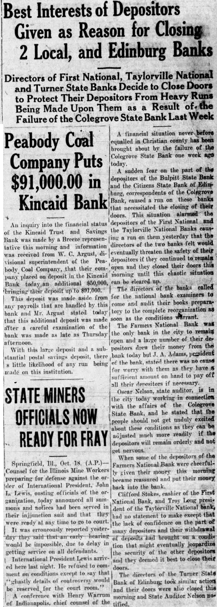 A financial situation never before equalled in Christian county has been brought about by the failure of the Colegrove State Bank one week ago today. A sudden fear on the part of the depositors of the Bulpitt State Bank and the Citizens State Bank of Edinburg, correspondents of the Colegrove Bank, caused a run on these banks that necessitated the elosing of their doors. This situation alarmed the depositors of the First National and the Taylorville National Banks caus* ting a run on them yesterday that the directors of the two banks felt would eventually threaten the safety of their depositors if they continued to remain open and they closed their doors this morning until this chaotic situation can be cleared up. The directors of the banks called for the national bank examiners to come and audit their books preparatory to the complete reorganization as soon as the conditions warrant. The Farmers National Bank was the only bank in the city to remain open and a large number of their depositors drew their money from the bank today but J. A. Adams, president of the bank. stated there was no cause for worry with them as they have a sufficient amount on hand to pay off all their depositors if necessary. Oscar Nelson, state auditor, is in the city today working in connection with the affairs of the Colegrove State Bank, and he stated that the people should not get unduly excited about these conditions as they can be adjusted much more readily if the depositors will remain orderly and not get nervous. When some of the depositors of the Farmers National Bank were cheerfulty given their money this morning became reassured and put their money back into the bank. Clifford Stokes, eashier of the First National Bank, and Troy Long president of the Taylorville National bank, had no statement to make except that the lack of confidence on the part of many depositors and their withdrawal of deposits had brought on a condition that might eventually jeopardize the security of the other depositors and they deemed it best to close their doors. The directors of the Turner State Bank of Edinburg took similar action and their doors were also closed this morning and State Auditor Nelson notified.