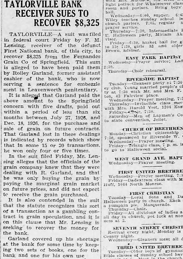 TAYLORVILLE BANK RECEIVER TO RECOVER $8,325 suit filed federal court Friday by M. Lensing. receiver defunct First National bank. of this city, to recover $8,325 from the Fernandes Grain of Springfield. This sum alleged to have been paid them by Rolley Garland. assistant cashier of the bank, who is now serving sentence for embezzle ment in alleged that Garland paid the above amount the Springfield concern with five drafts, paid within period of less than six months between 27. 1926. Dec. 18, 1926. for and grain on future contracts. That these dealings indicated by which show that some 15 or he only four five times. In the suit filed Friday. Mr. LenWEST GRAND BAPTIST sing alleges the officials of the grain that they were dealing Garland, and that he only buying grain by paying marginal grain market on future prices, and did not expect to receive the grain purchased. also contended in the suit that the statute recognizes this sort of transaction gambling contract grain speculation. this clause that Mr. Lensing seeking recover the money for Garland up his shortage at the bank for time by keeping sets of books, for the bank and one for his own use