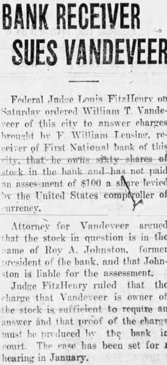 Attorney for Vandeveer argued hat the stock in question is in the name of Roy A. Johnston. former president of the bank. and that Johnston is liable for the assessment. Judge FitzHenry ruled that the charge that Vandeveer is owner of the stock is sufficient to require an answer and that proof of the charge must be produced by the bank it court. The case has been set for hearing in January.