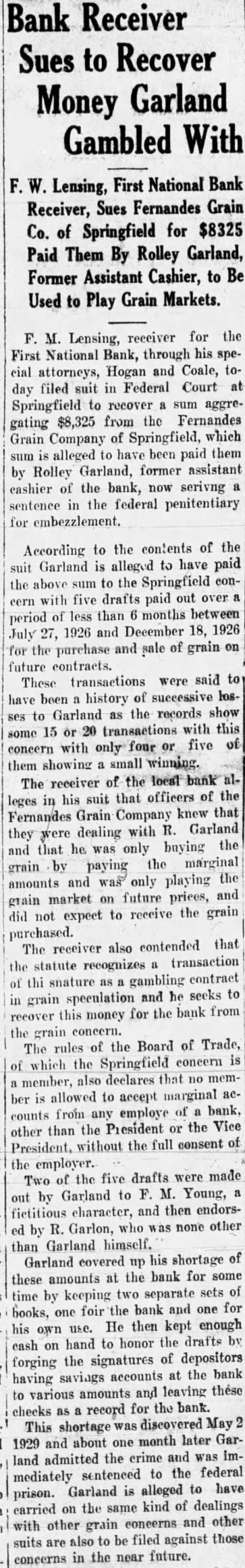 F. M. Lensing, receiver for the First National Bank, through his special attorneys, Hogan and Coale, today filed suit in Federal Court at Springfield to recover a sum aggregating $8,325 from the Fernandes Grain Company of Springfield, which sum is alleged to have been paid them by Rolley Garland, former assistant cashier of the bank, now serivng a sentence in the federal penitentiary for embezzlement.