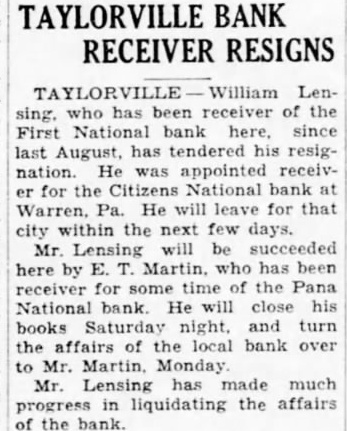 Lenhas of the First National bank here. since last August, has resignation. was appointed receivfor the Citizens National bank He will leave for that city within next few days. Mr. Lensing will succeeded here by who has been receiver for some time the Pana National bank. He close his books Saturday night, and turn the of the local bank over Mr. Martin, Monday Mr. Lensing has made much in liquidating the affairs progress the bank.