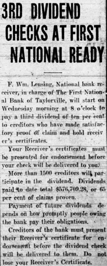 F. Wm. Lensing, National bank receiver, in charge of The First National Bank of Taylorville, will start on Wednesday morning at 8 'clock to pay a third dividend of ten per eent to creditors who have made satisfacfory proof of claim and hold receiv er's certificates. Your Receiver's certificates must be presented for endorsement before your check will be delivered to you! More than 1500 creditors will participate in the dividend, Dividends paid to date total $576,709.28, or 65 per cent of claims proven. Payment of future dividends de pends on how promptly people owing the bank pay their obligations. Creditors of the bank must present their Receiver's certificate for endorsement before the dividend check will be delivered to them. Do not lose your Receiver's Certificate.