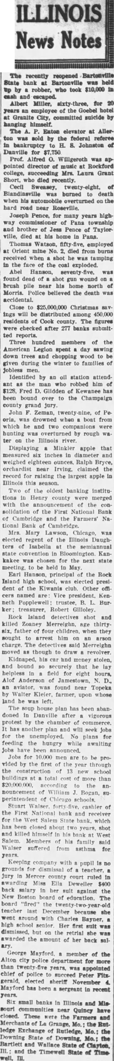 recently reopened Bartonville bank Bartonville was held up by robber, who took $10,000 in cash and escaped. Albert Miller, sixty-three, for 20 an employee the Goebel Granite City, committed suicide by hanging himself. The Eaton elevator at Allerton by the federal referee in bankruptcy H. Johnston of Danville for Prof. Alfred Willgeroth appointed director of music college, Mrs. Laura Grant Short, who died Cecil Sweasey, twenty-eight. of Blandinsville burned death his automobile overturned the hard road near Roseville. Joseph Pence, for many years highPana township and brother Jess Pence Taylordied at his home in Pana. Thomas Watson, employed at Orient mine died from burns received when shot he tamping the face the exploded. Abel Hanson, seventy-five was found dead of shot gun wound on brush pile near his home north of Morris. Police believed the death was accidental. Close to $25,000,000 Christmas savIngs will distributed among 450,000 residents Cook county. The figures were checked after 277 banks submitted reports. Three hundred members of the American Legion spent day sawing down trees chopping wood to during the winter to families of Jobless Identified by an oil station attendthe robbed him of $128, Fred Glidden of Kewanee been bound over to the Champaign county grand jury. John Zeman, of Peoria, drowned when boat from which and companions were hunting was overturned by rough water Illinois river. Displaying Minkler apple that six inches In diameter and weighed eighteen ounces, Ralph Bryce, orchardist near Irving. claimed the record for raising the largest apple In Illinois this Two the oldest banking institutions Henry county merged the of the consolidation the First National Bank Cambridge the Farmers' National Bank of Cambridge. Mrs. Mary Lawson, Chicago, elected regent the Daughters Isabella the semiannual Bloomington. Kankakee was for the next state held May Earl Hanson, the Rock Island high school, elected presithe Kiwanis club. Other offinamed president, Kenneth Popplewell trustee, Burtreasurer, Robert Gilloley. Rock Island detectives shot and killed Zoaney Merreighn, age thirtysix, father four when they sought arrest him an arson charge. The said Merreighn moved as though to draw revolver. Kidnaped, his car and money stolen, and bound securely that lay helpless field for eight hours, Alof Anderson of Jamestown, N. aviator, found near Topeka Walter Kleier, farmer, upon whose land was left. soup house plan has been abandoned in Danville after vigorous protest by the of has plan will seek jobs for the No plans for the hungry awaiting jobs have announced. 10,000 to he provided of the year through the construction 13 new school buildings total cost of more than $20,000,000, according the announcement William Bogan, superintendent of Chicago Stuart Walser, cashier of the First National bank receiver for the West Salem State bank, which has been shot and killed himself in his bank West Salem. Members of family said Walser suffered from asthma for years. Keeping company with pupil Is no grounds for dismissal of teacher, jury Mercer county court ruled In awarding Miss Ella Deweller $400 salary her suit against the New Boston board of education. board "fired" the teacher last December because she around Bayner, high school senior. Her first suit was on the retrial she was awarded the amount of her back solary. George Mayford, a member of the Alton department for more than years, appointed chief police succeed Peter Fitzgerald, elected sheriff November Mayford has been sergeant in recent years. Six small banks In Illinois and Miscommunities Quincy closed. These the Farmers and Merchants of Grange, the Rutledge Exchange of Rutledge, Mo.; the Downing State Downing. Mo.; the Bartlett Wallace State Clayton, the Timewell State of Timewell, III. Donald Harper, Mr. Mrs. Glenn Brown Louisville, has probably the largest number grandparents of child in Illinois. He grandparents all their combined ages total six years. Four indicted the Hengrand jury for the kidnapfor Earl Yocum, Galva banker. Those indicted under that charge and Wiskers, Vernon Ahigren and Lloyd Winslow. All are fall Cambridge except Orville for whom the authorities are searching.