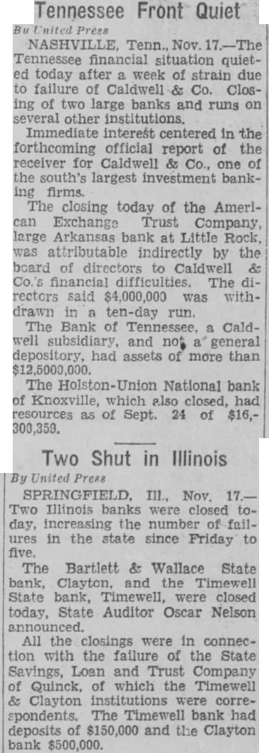 Tennessee Front Quiet Tenn. Nov today of strain due failure of Closing of two large banks and runs on Immediate interest centered in the forthcoming official report of the receiver for one the south's largest bankThe closing today of the American Exchange Trust Company, Arkansas bank Rock, attributable indirectly by the board directors Caldwell difficulties. rectors said $4,000,000 was withdrawn ten-day The Bank Tennessee, Caldwell subsidiary, and not general depository. had assets more than The National bank of of Sept. 24 of $16,300,359. Two Shut in Illinois United Nov. Illinois were closed day, of failin the state since Friday to The Bartlett Wallace State bank, and State bank, closed today, State Auditor Oscar Nelson All the closings in the failure the State Savings, Company Quinck, which Clayton correspondents. The Timewell bank deposits of $150,000 the Clayton $500,000.