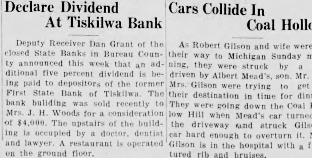 Declare Dividend Cars Collide In At Tiskilwa Bank Coal Hollow Deputy Receiver Dan Grant of the As Robert Gilson and wife closed State Banks in Bureau Countheir way to Michigan Sunday announced this week that they were struck by ditional five percent dividend driven by Albert Mr. ing paid to depositors of the former Mrs. Gilson were to get trying First State Bank of The their destination time for in bank buliding sold recently They were going the Coal down Woods for consideration low Hill when Mead's car turned The upstairs of the build- the driveway and struck is occupied by doctor. dentist hard car enough to overturn it. and lawyer. is operated Gilson the hospital the ground floor. tured rib and bruises.