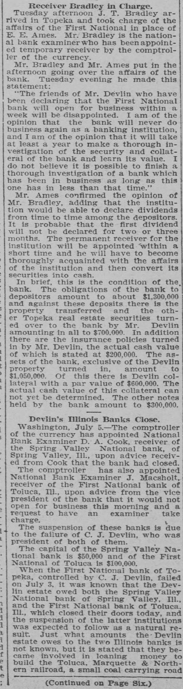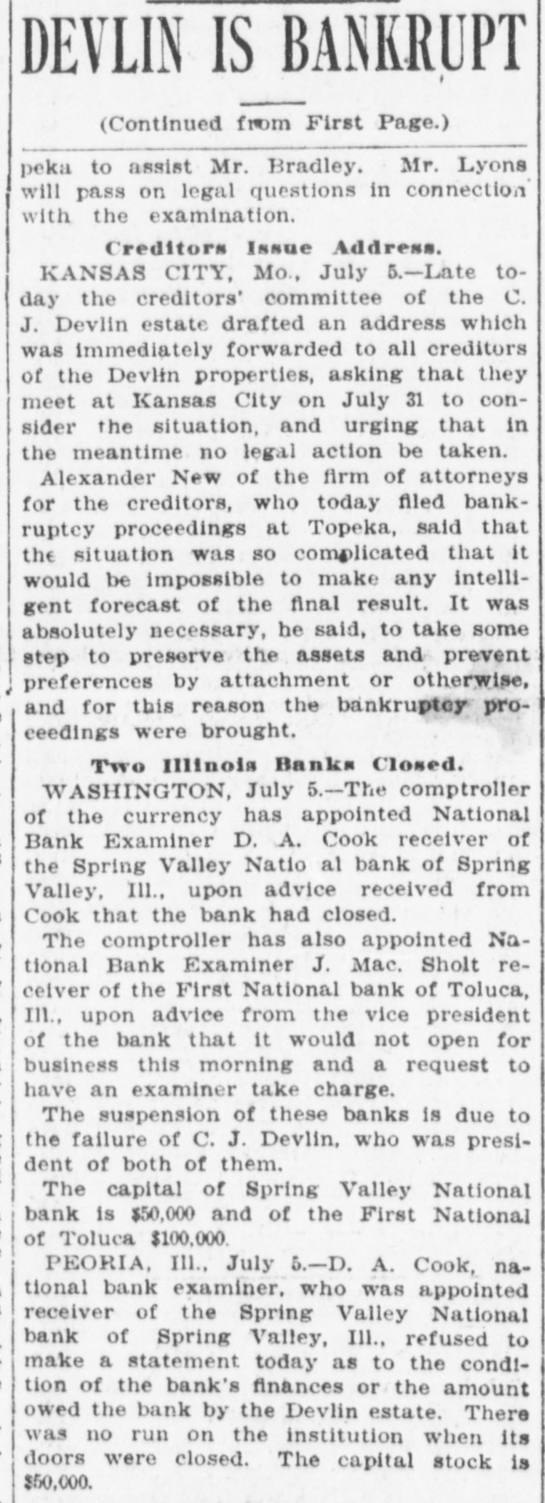 DEVLIN BANKRUPT Petition Filed In the Federal Court Asking That He Be Declared Bankrupt-Two Illinois Banks Compelled to Close Owing to the Devlin Failure. Topeka, July 5.-A petition to declare C. J. Devlin a bankrupt was filed in the federal court today on behalf of the Kansas City creditors. Runs on the Topeka banks which started Monday, following the failure of the First National Bank had apparently been stopped when the institutions opened today. There was no excitement. The bank officials stated they were in better shape than ever to meet demands. Washington, July 5.-The comptroller of the currency has appointed a national bank examiner receiver for the Spring Valley National bank, Spring Valley, Ill., and the First National Bank of Toluca, Illinois, upon information that both institutions had closed. Suspension of the banks is due to failure of C. J. Devlin, president of both of them. The capital of the Spring Valley National bank is $50,000, of the First National Bank or Tulouca, $100,000. Topeka, July 5.-Just what amounts the Devlin estate owes to the Spring Valley and Toluca banks is not known, but it is stated they became involved in loaning money to build the Toluca, Marquette & Northern railroad, a small coal carrying road which Devlin was constructing to his mining property in Illinois.