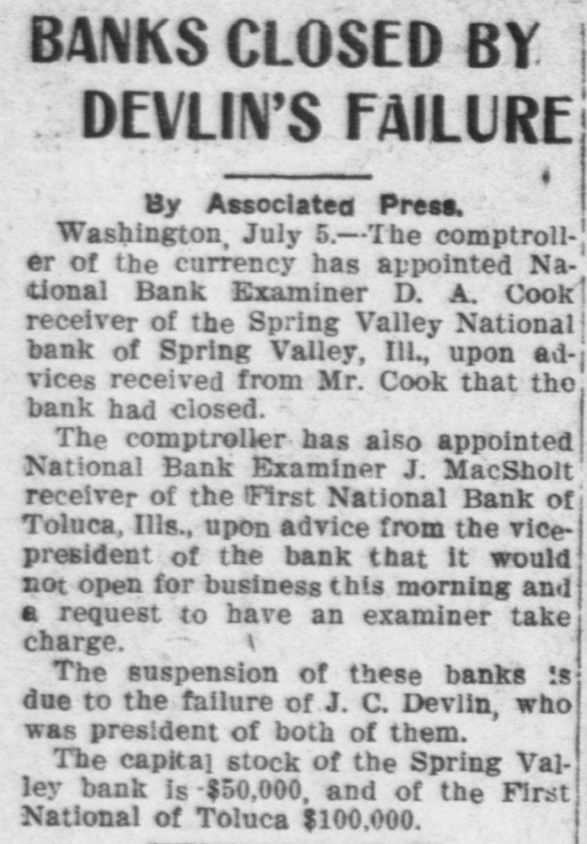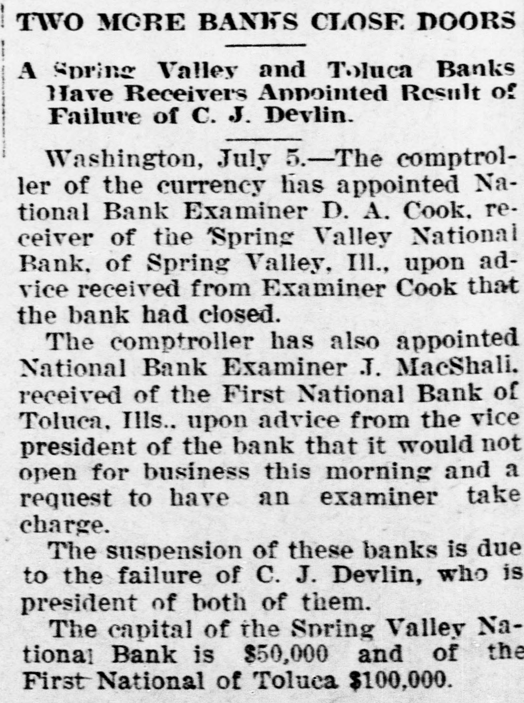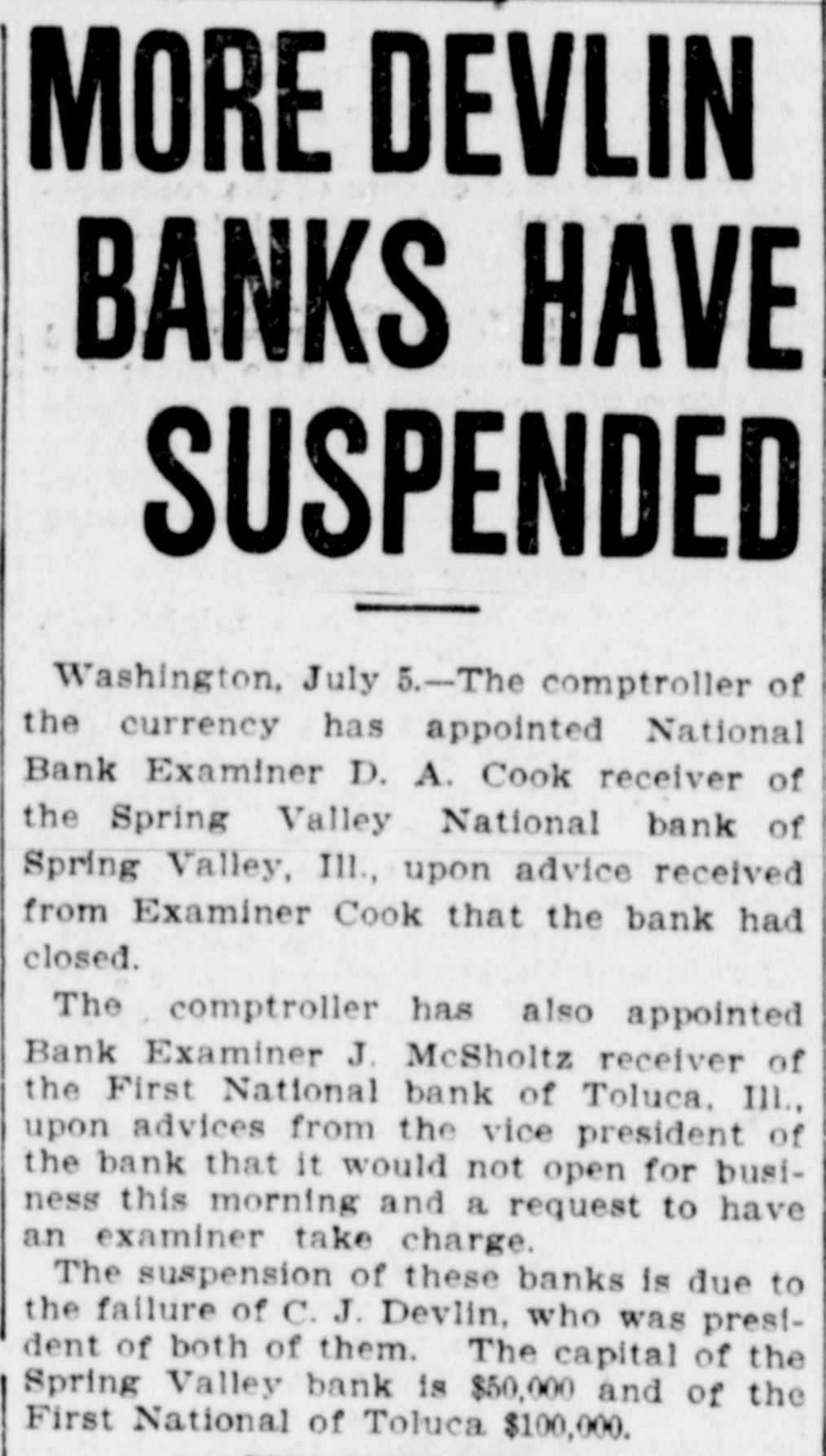 the First National bank of Toluca, Ill., upon advice from the vice president of the bank that it would not open for business this morning and a request to have an examiner take charge. The suspension of these banks is due to the failure of C. J. Devlin, who was president of both of them.