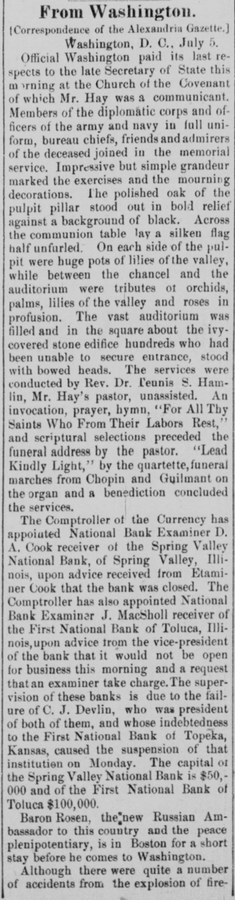 From Washington. [Correspondence of the Alexandria Gazette.] Washington, D. C., July 5. Official Washington paid its last respects to the late Secretary of State this m orning at the Church of the Covenant of which Mr. Hay was a communicant. Members of the diplomátic corps and officers of the army and navy in full uniform, bureau chiefs, friends and admirers of the deceased joined in the memorial service. Impressive but simple grandeur marked the exercises and the mourning decorations. The polished oak of the pulpit pillar stood out in bold relief against a background of black. Across the communion table lay a silken flag half unfurled. On each side of the pulpit were huge pots of lilies of the valley, while between the chancel and the auditorium were tributes of orchids, palms, lilies of the valley and roses in profusion. The vast auditorium was filled and in the square about the ivycovered stone edifice hundreds who had been unable to secure entrance, stood with bowed heads. The services were conducted by Rev. Dr. l'eunis S. Hamlin, Mr. Hay's pastor, unassisted. An invocation, prayer, hymn, "For All Thy Saints Who From Their Labors Rest," and scriptural selections preceded the funeral address by the pastor. "Lead Kindly Light," by the quartette, funeral marches from Chopin and Guilmant on the organ and a benediction concluded the services. The Comptroller of the Currency has appointed National Bank Examiner D. A. Cook receiver of the Spring Valley National Bank, of Spring Valley, Illinois, upon advice received from Etaminer Cook that the bank was closed. The Comptroller has also appointed National Bank Examiner J. MacSholl receiver of the First National Bank of Toluca, Illinois, upon advice from the vice-president of the bank that it would not be open for business this morning and a request that an examiner take charge. The supervision of these banks is due to the failure of C. J. Devlin, who was president of both of them, and whose indebtedness to the First National Bank of Topeka, Kansas, caused the suspension of that institution on Monday. The capital of the Spring Valley National Bank is $50,000 and of the First National Bank of Toluca $100,000. Baron Rosen, the*new Russian Ambassador to this country and the peace plenipotentiary, is in Boston for a short stay before he comes to Washington. Although there were quite a number of accidents from the explosion of fire-