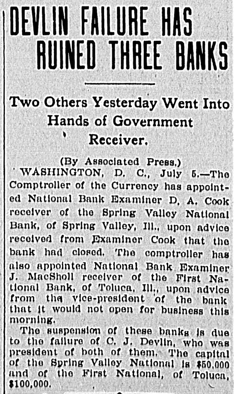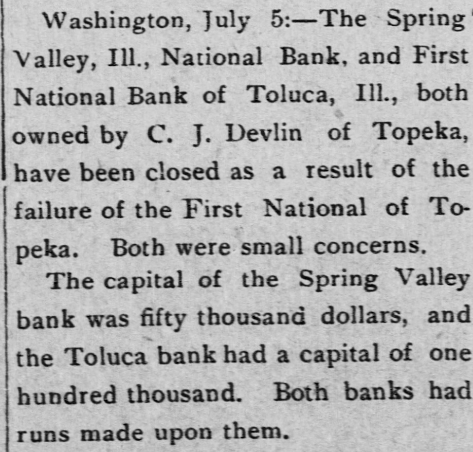 Washington, July 5:-The Spring Valley, Ill., National Bank, and First National Bank of Toluca, Ill., both owned by C. J. Devlin of Topeka, have been closed as a result of the failure of the First National of Topeka. Both were small concerns. The capital of the Spring Valley bank was fifty thousand dollars, and the Toluca bank had a capital of one hundred thousand. Both banks had runs made upon them.