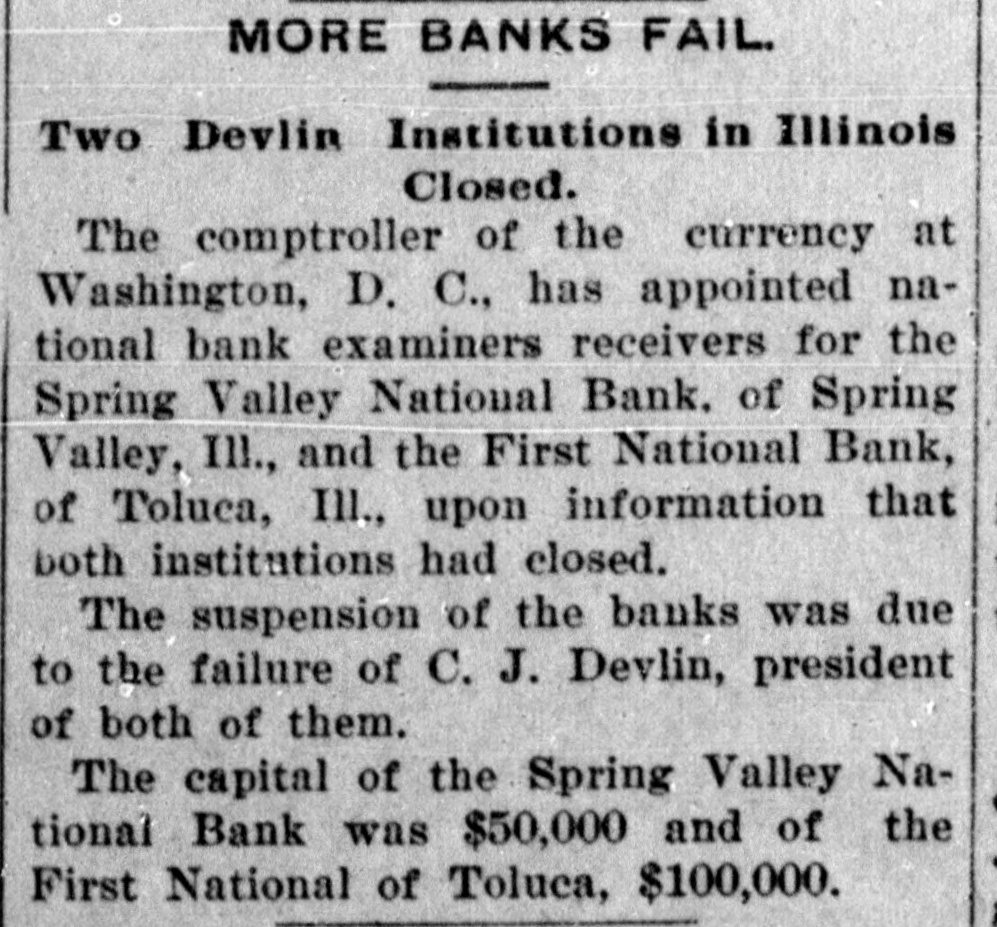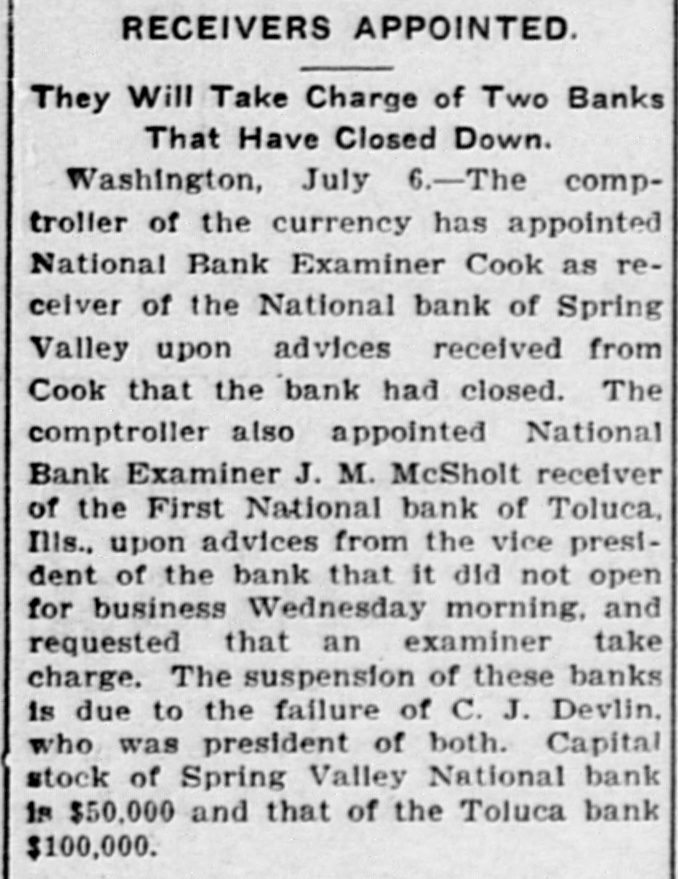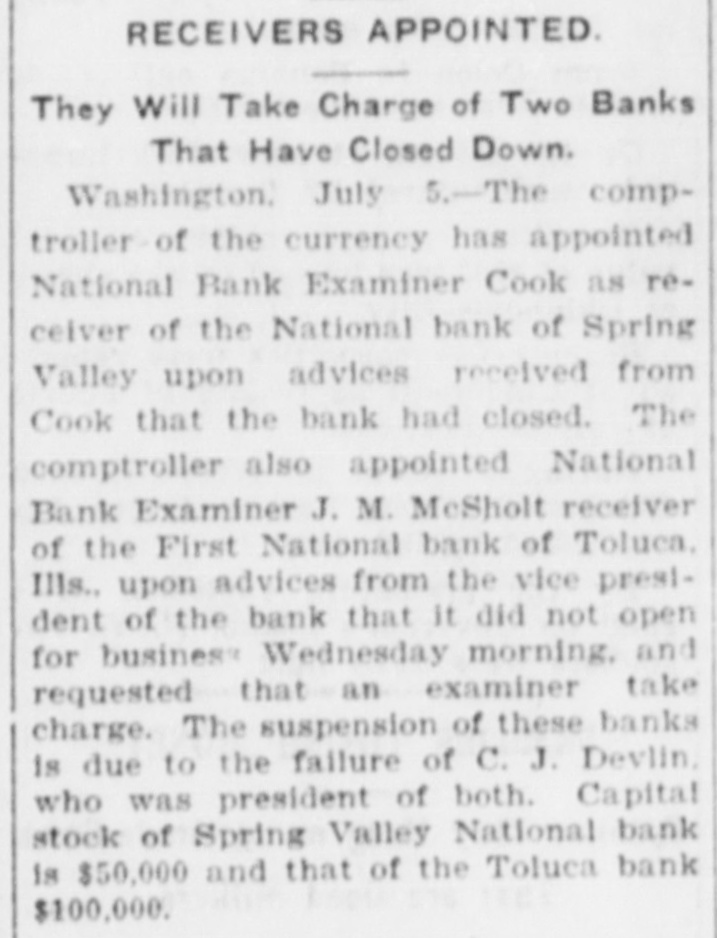 MORE BANKS FAIL. Two Devlin Institutions in Illinois Closed. The comptroller of the currency at Washington, D. C., has appointed national bank examiners receivers for the Spring Valley National Bank. of Spring Valley, Ill., and the First National Bank, of Toluca, Ill., upon information that both institutions had closed. The suspension of the banks was due to the failure of C. J. Devlin, president of both of them. The capital of the Spring Valley National Bank was $50,000 and of the First National of Toluca, $100,000.