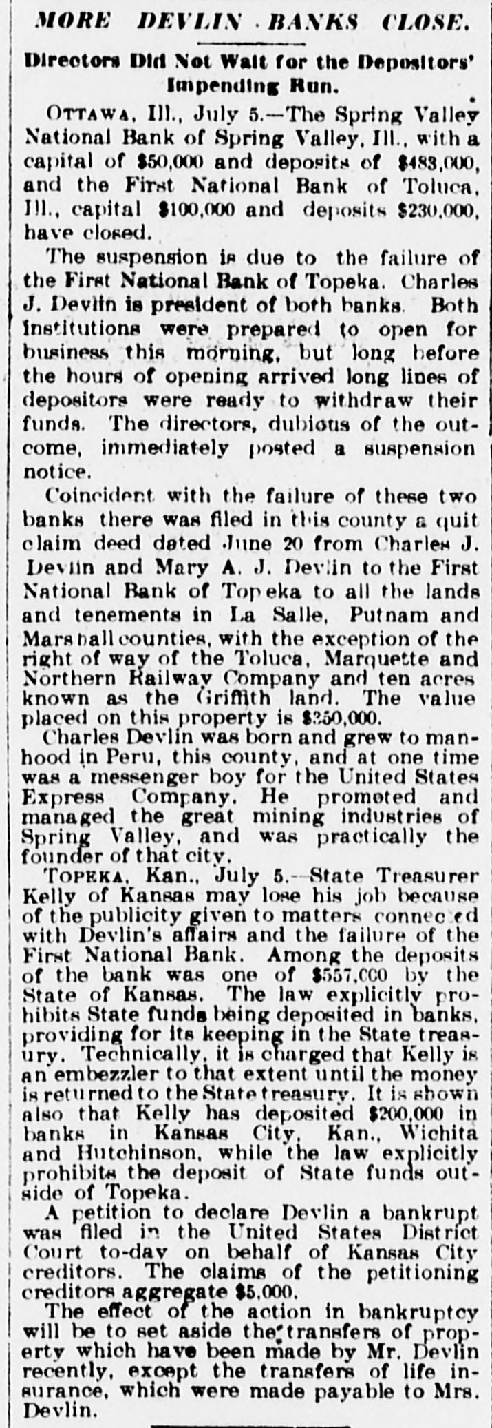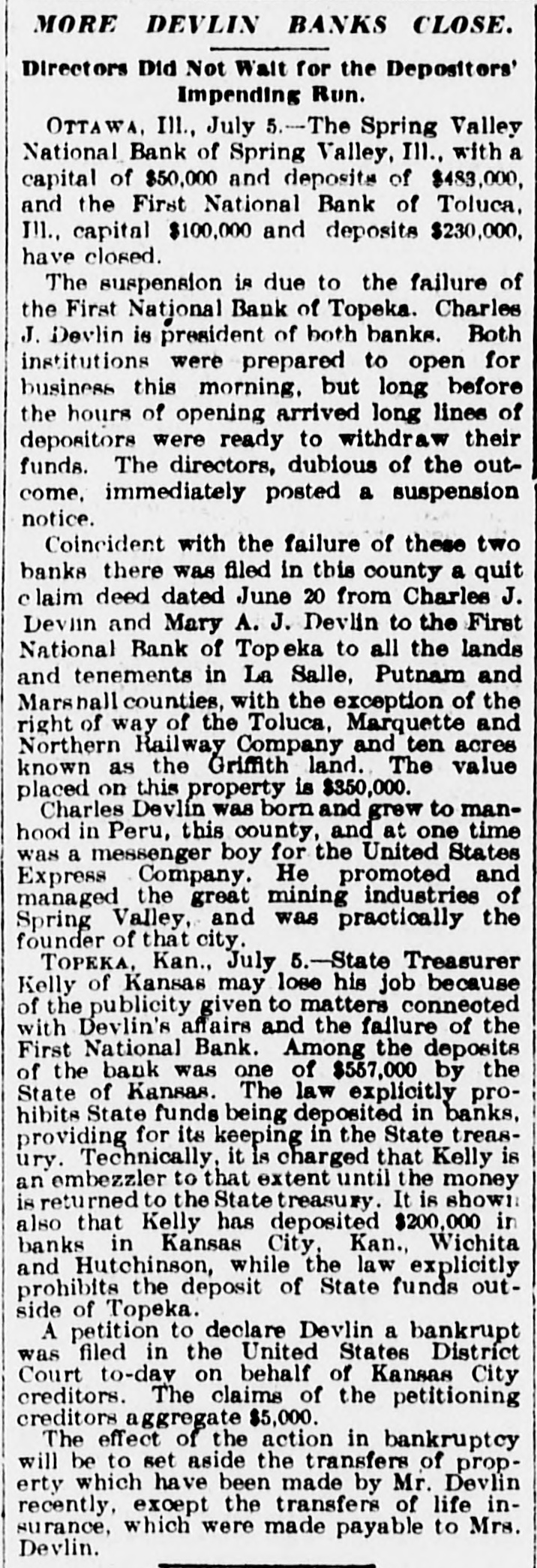 MORE DEVLIN BANKS CLOSE. Directors Did Not Wait for the Depositors' Impending Run. OTTAWA, Ill., July 5.-The Spring Valley National Bank of Spring Valley, Ill., with a capital of $50,000 and deposits of $483,000, and the First National Bank of Toluca, III., capital $100,000 and deposits $230,000, have closed. The suspension is due to the failure of the First National Bank of Topeka. Charles J. Devlin is president of both banks. Both institutions were prepared to open for business this morning, but long before the hours of opening arrived long lines of depositors were ready to withdraw their funds. The directors, dubious of the outcome, immediately posted a suspension notice. Coincident with the failure of these two banks there was filed in this county a quit claim deed dated June 20 from Charles J. Deviin and Mary A. J. Devlin to the First National Bank of Topeka to all the lands and tenements in La Salle, Putnam and Marshall counties, with the exception of the right of way of the Toluca, Marquette and Northern Railway Company and ten acres known as the Griffith land. The value placed on this property is $350,000. Charles Devlin was born and grew to manhood in Peru, this county, and at one time was a messenger boy for the United States Express Company. He promoted and managed the great mining industries of Spring Valley, and was practically the founder of that city. TOPEKA, Kan., July 5.-State Treasurer Kelly of Kansas may lose his job because of the publicity given to matters connected with Devlin's affairs and the failure of the First National Bank. Among the deposits of the bank was one of $557,000 by the State of Kansas. The law explicitly prohibits State funds being deposited in banks, providing for its keeping in the State treasury. Technically, it is charged that Kelly is an embezzler to that extent until the money is returned to the State treasury. It is shown also that Kelly has deposited $200,000 in banks in Kansas City, Kan., Wichita and Hutchinson, while the law explicitly prohibits the deposit of State funds outside of Topeka. A petition to declare Devlin a bankrupt was filed in the United States District Court to-day on behalf of Kansas City creditors. The claims of the petitioning creditors aggregate $5,000. The effect of the action in bankruptcy will be to set aside the transfers of property which have been made by Mr. Devlin recently, except the transfers of life insurance, which were made payable to Mrs. Devlin.