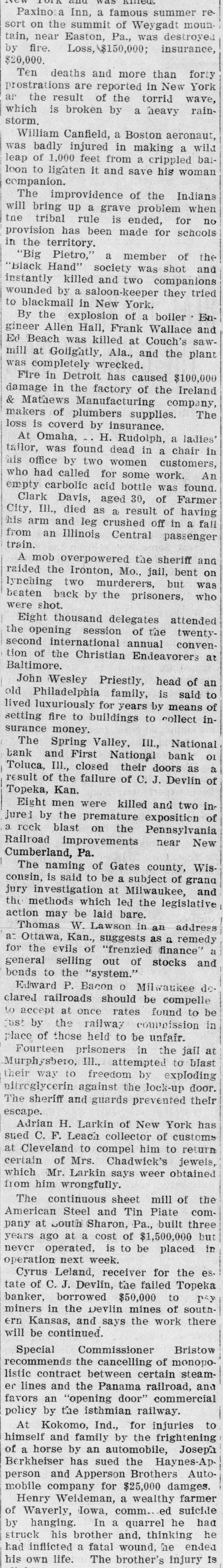 each. 000'T$ JO 11 J. Devlin filed in the United States ict court at Topeka, Kan., an involry petition in bankruptcy. The pe1 schedules liabilities exceeding '000' mes W. Alderdice, a lawyer cond in New York of forgery, was in send to 18 years' imprisonment A. Sing. Spekenhier has been appointed ver of the Commercial bank, of rstown, Ind., on application of dent Frank Mason. The liabilities d $100,000. while the assets are as much less than that amount. ry Walker, aged 18 years, and Worrall, aged 12, were drowned in 'oughiagheny river near McKeesPa. seventh international convention e Epworth league was opened in Coll '. ornado in Texas caused much loss : and destruction of property in gue county and the northern porof the state. Twenty-four are 1 to be dead. five-year-old son of Samuel Squillof Seymour, Ia., and the fourld son of a neighbor, George Bilvere burned to death in a fire destroyed Squillman's home. man Meminger, chief of the Mile (Wis.) fire department, died he effects of injuries sustained at two months ago, when it was re1 he inhaled acid fumes. 1 Ross, who was knocked out by Donnelly in the sixteenth round rize fight at Aberdeen, Wash., is His neck was dislocated and a clot gathered on the brain. e railroad employes were killed vo injured and thousands of dolworth of property destroyed by a n collision on the Fitchburg divi: the Boston & Maine railroad-near isett, Mass. Amasa Cobb, brigadier general unteers during the civil war, vetf the Mexican war, congressman x-justice of the supreme court of ska, died at Los Angeles, Cal, aged S. formal opening of the twenty-secternational Christian Endeavor tion took place in Armory hall, ore, Md., with about 8,000 delepresent. Lucie B. Tyng. one of the best1 temperance workers in the Unittes, died in Peoria. III. new directory indicates Chicago's tion to be 2,272.000. weekly crop report shows that 1 has been retarded by heavy but the 'condition of corn in the elt is excellent money circulation July 1 was the : per capita and in amount in the y of the country. Bank note is1 the past year were larger than w gold increase. : of the Chicago indicted packers, gents and the companies in which are interested have furnished Hanly's crusade against bookS has put an end to horse racing in e uel Thompson, a Chicago coffer er, says the scheme of an eastern to have a tax imposed is a marke' ulation to secure $12,000,000 profit ck. me Stewart's will, dividing an es$500,000 between his widow, chilrothers and sisters, was filed in o Spring Valley (III.) national bank e First national bank of Toluca, sed their doors as the result of the of C. J. Devlin, of Topeka, Kan. Frazer of Chicago, when asked