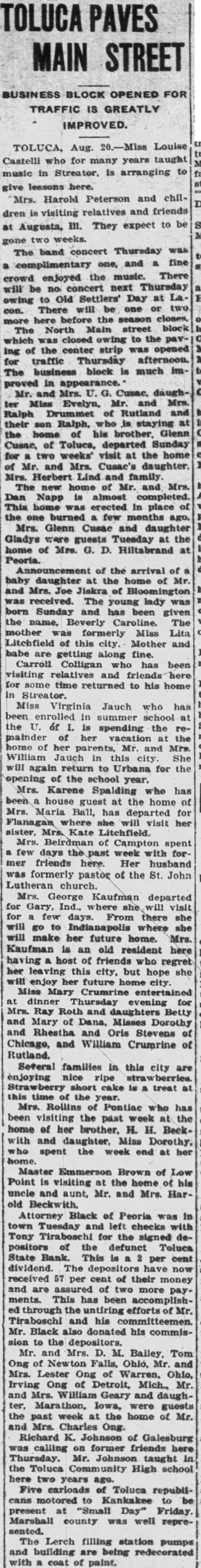 MAIN STREET OPENED FOR TRAFFIC IS GREATLY IMPROVED. TOLUCA, Aug. Louise Castelli for many years taught music in Streator, arranging give here. Harold Peterson and children visiting and friends III. They expect to be Augusta, weeks. The band concert Thursday and fine one, the music. There crowd enjoyed concert next Thursday Old Settlers' Day at owing There the season closes. more The North Main street which closed to the center strip opened for traffic Thursday afternoon. The business block much Mrs. Evelyn, Mr. and Rutland and their son the his Glenn Cusae, of Toluca, Sunday two weeks' visit at the home and Mrs. Cusac's daughter. Herbert Lind and family. new home Mr. and Mrs. Dan Napp almost completed. This home erected in place the one burned few Mrs. Glenn Cusae daughter Gladys were guests Tuesday at the home Hiltabrand Peoria. the arrival baby daughter the home of Mr. and Mrs. Joe Jiskra received. The young lady born Sunday given the name, Beverly Caroline. The mother formerly Miss Lita Litchfield of this city. Mother and getting along fine. Carroll Colligan been visiting and friends for some time returned to his home Streator. Miss Virginia Jauch who been school the spending the mainder of her home of her Mr. and Mrs. Jauch this She again return Urbana for the of the school year. Mrs. Karene Spalding who has been house guest at home of Mrs. Maria Ball, has departed for Flanagan where will visit her sister, Mrs. Kate Litchfield. Beirdman Campton spent few days past week former friends here. Her husband formerly pastor of the St. John church. Mrs. George Kaufman departed Gary, Ind., where visit for From there she Indianapolis where she will make her future home. Kaufman is an old resident here host friends regret her this city, but hope she enjoy future city. Miss Crumrine entertained evening for Ray and daughters Betty and Mary of Dana, Misses Dorothy and Rhestha and Oris Stevens Chicago, and William Crumrine of Rutland. Several families in this city are enjoying nice ripe Strawberry short cake treat this time the year. Mrs. Rollins Pontiac who has been visiting the past week the home of her brother, H. Beckand daughter, Miss spent week end at her Master Emmerson Brown of Low Point is visiting the home of his uncle and aunt, Mr. and Mrs. Harold Attorney Black of Peoria Tuesday checks with Tony Tiraboschi for signed positors defunct Toluca State Bank. This cent per dividend. The depositors have now received per cent of their money and assured of two more ments. This been through the Tiraboschi and his Mr. Black donated his commisdepositors. Mr. and Mrs. Tom Ong Ohio, and Mrs. Ong Warren, Ohio, Irving Ong of Detroit, Mich, Mr. Mrs. Geary and daughMarathon, were guests the at the home of Mr. Mrs. Charles Ong. Richard of Galesburg calling former friends Thursday. taught the Toluca Community High school here two years carloads Toluca republimotored Kankakee present "Small Day" Friday. Marshall county was well sented. Lerch filling station pumps and building being redecorated with coat of paint.