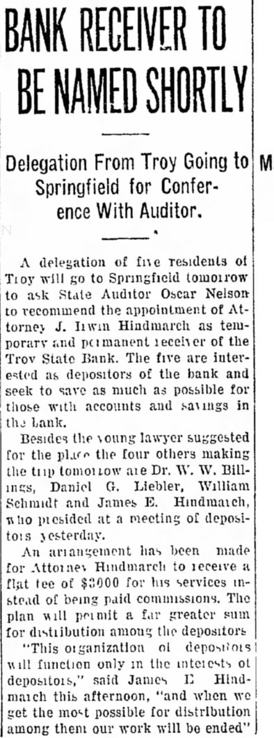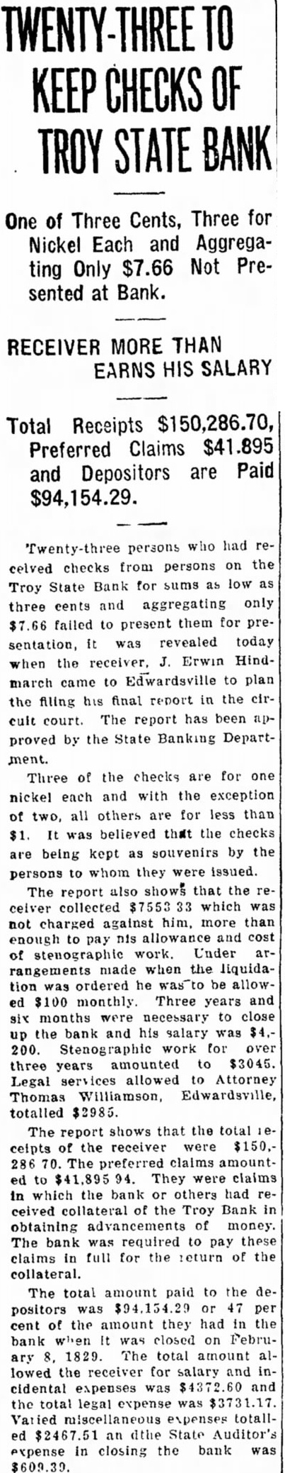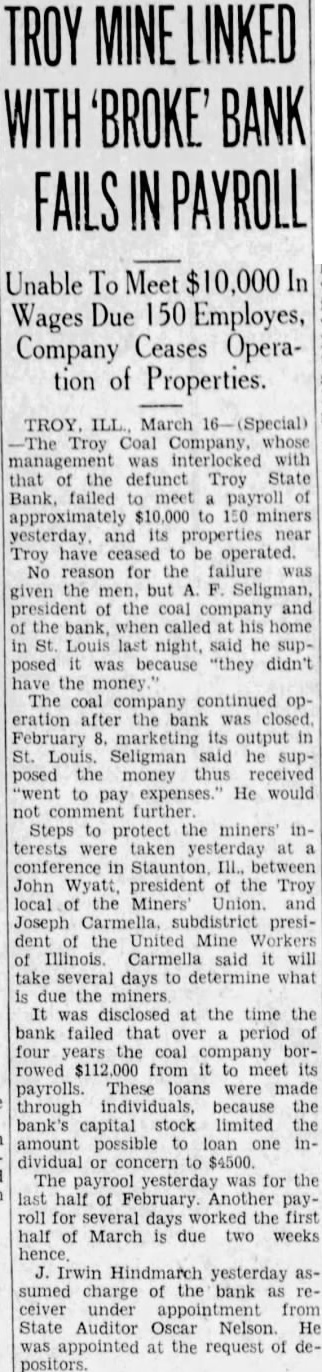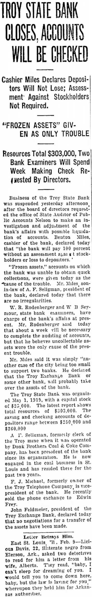 BANK CHECKED Cashier Miles Declares tors Will Not Lose; Assessment Against Stockholders Not Required. ASSETS" EN AS ONLY TROUBLE Bank Examiners Will Spend Week Making Check quested By Directors. Business of the Troy State Bank was suspended yesterday afternoon after the board of directors requested the office of State Auditor of Public Accounts Nelson to make an investigation and adjustment of the bank's affairs with possible liquidation of accounts. Benton Miles, cashier of the bank, declared today that bank will pay 100 percent without assessment stockholders loss to depositors. accounts on which the bank was unable to obtain quick collections, were today the "cause the trouble. Miles sonin-law of Seligman, president of the bank, declared today that there irregularities. Rodenberger and Seymour, state bank examiners, have charge of the bank's affairs at present. Mr. Rodenberger said today that about week vill be necessary complete the auditing of accounts, but that he believes uncollectable sets were the only cause of the present trouble. Mr. Miles said was simply other case of the city being too small banks. He declared support two that the Troy Exchange Bank some other bank, will probably take the assets of the bank. over The Troy State Bank was organizwith capital stock May 1319, The latest report shows of of $303,000. The total resources and accounts of desaving checking between and positors range $260,000 Seligman, clerk of the Troy mine when operated Brothers Coal Coke Comby Donk pany, has president of the bank its organization. He now since in the coal business St. engaged Louis and has resided there for the past years. Michael, formerly of the Telephone viceTroy of the bank. He recently president sold the phone exchange to Edwin Frey. of the John Feldmeier, president Troy Exchange Bank. declared today for transfer of that negotiations the assets have been made. Letter Betrays Him. St. Louis Feb. East illiterate negro from Davis, 22, asked two detectives Elerson, Ark., him letter from his to read for wife, Alberta. They read, "baby, can't sleep for dreaming of you. tell to come down here, would you baby. but the law laving for held him for Arkanwhereupon they sas authorities.