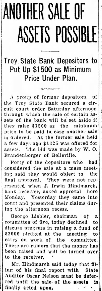 POSSIBLE Troy State Bank Depositors to Put Up as Minimum Price Under Plan. of former depositors the Troy State Bank secured circuit court order Saturday afternoon through which the sale certain sets of the bank will be set aside if $1500 as the minimum price to be paid in case another the former sale held ago was offered for assets. The bid was made by of Belleville. Forty of the depositors who had considered the sale mass sald they would object the final approval. They not resented when Irwin Hindmarch, bank receiver, asked approval here Monday. Yesterday they came into court and presented their claims ing the afternoon recess. George Liebler, chairman of committee of five, today declined discuss progress in raising a fund of $2000 pledged at the meeting carry work of the committee. There are rumors that the money has been raised and will be turned over to the Mr. Hindmarch said today that ing of his final with State report Auditor Oscar Nelson must be deferred until the sale of the assets finally acted upon.