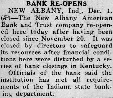 Articles report heavy withdrawals (a run) tied to failures of Louisville banks and runs on nearby New Albany banks; directors closed the bank Nov 20, 1930 to protect depositors and it reopened Dec 1, 1930 after meeting state banking department requirements. Cause attributed to funds tied up in failed Louisville banks and contagion from other local bank failures.