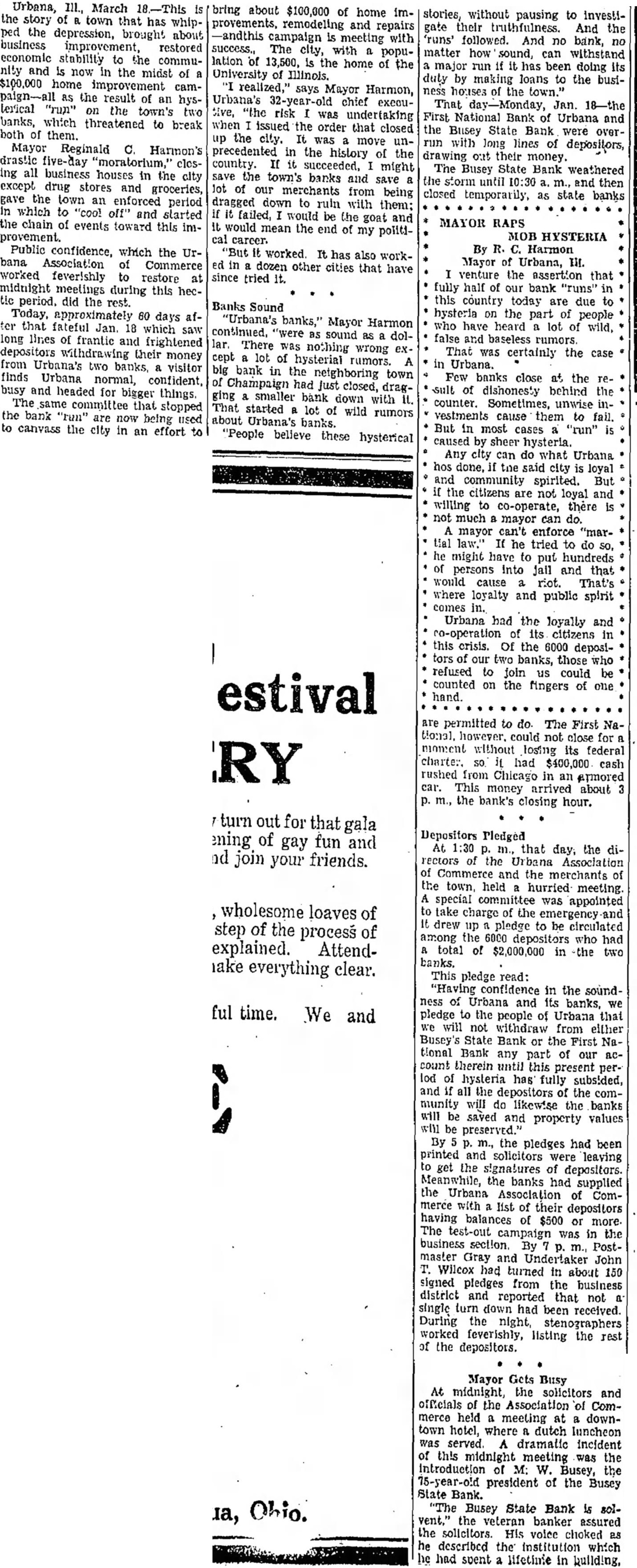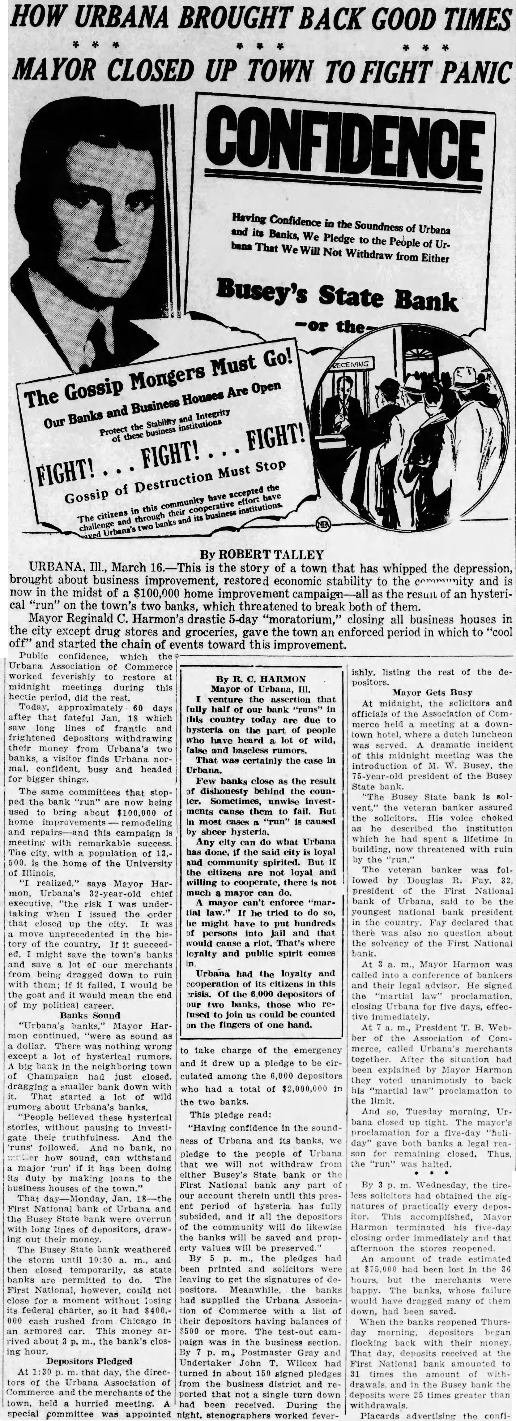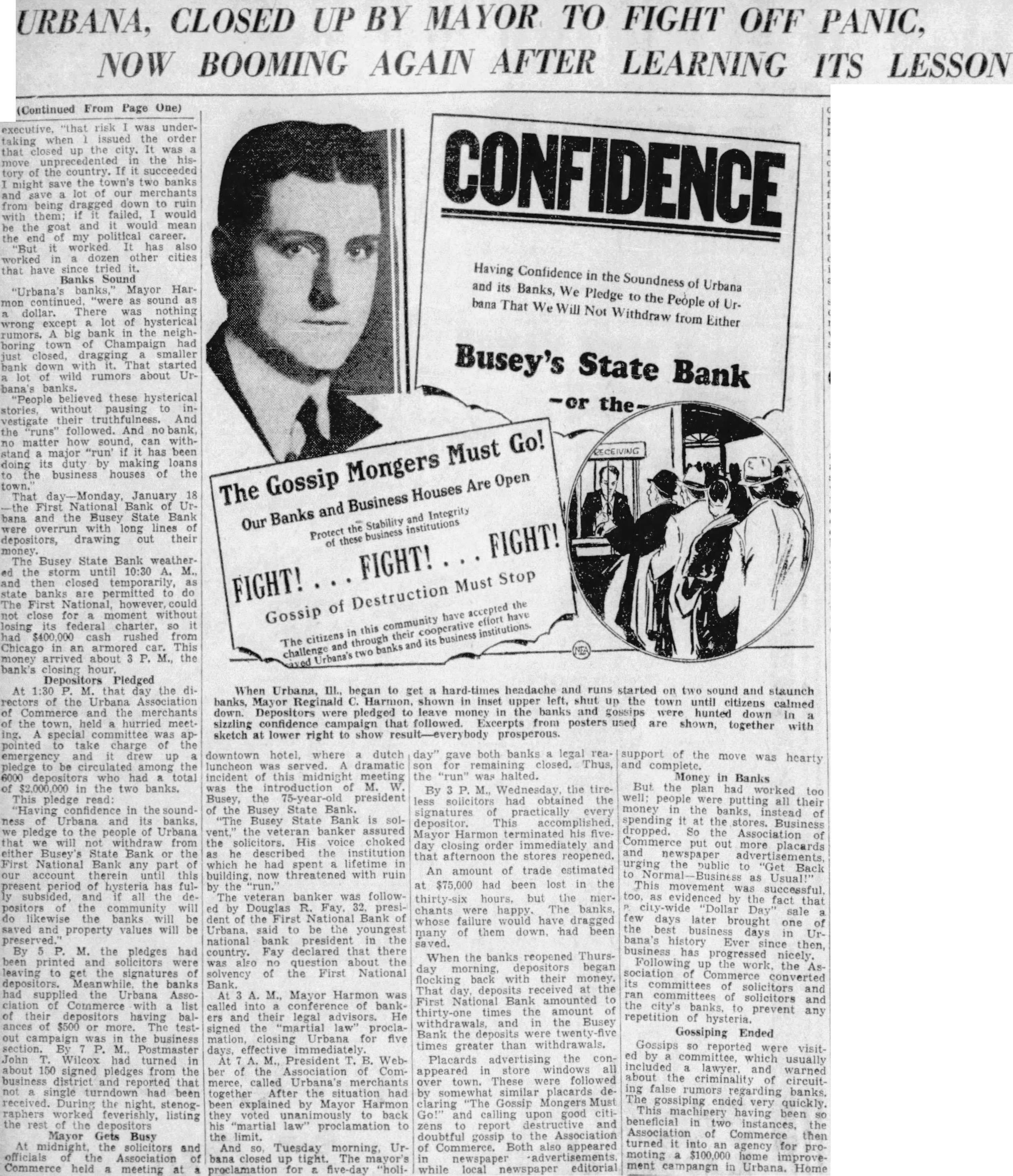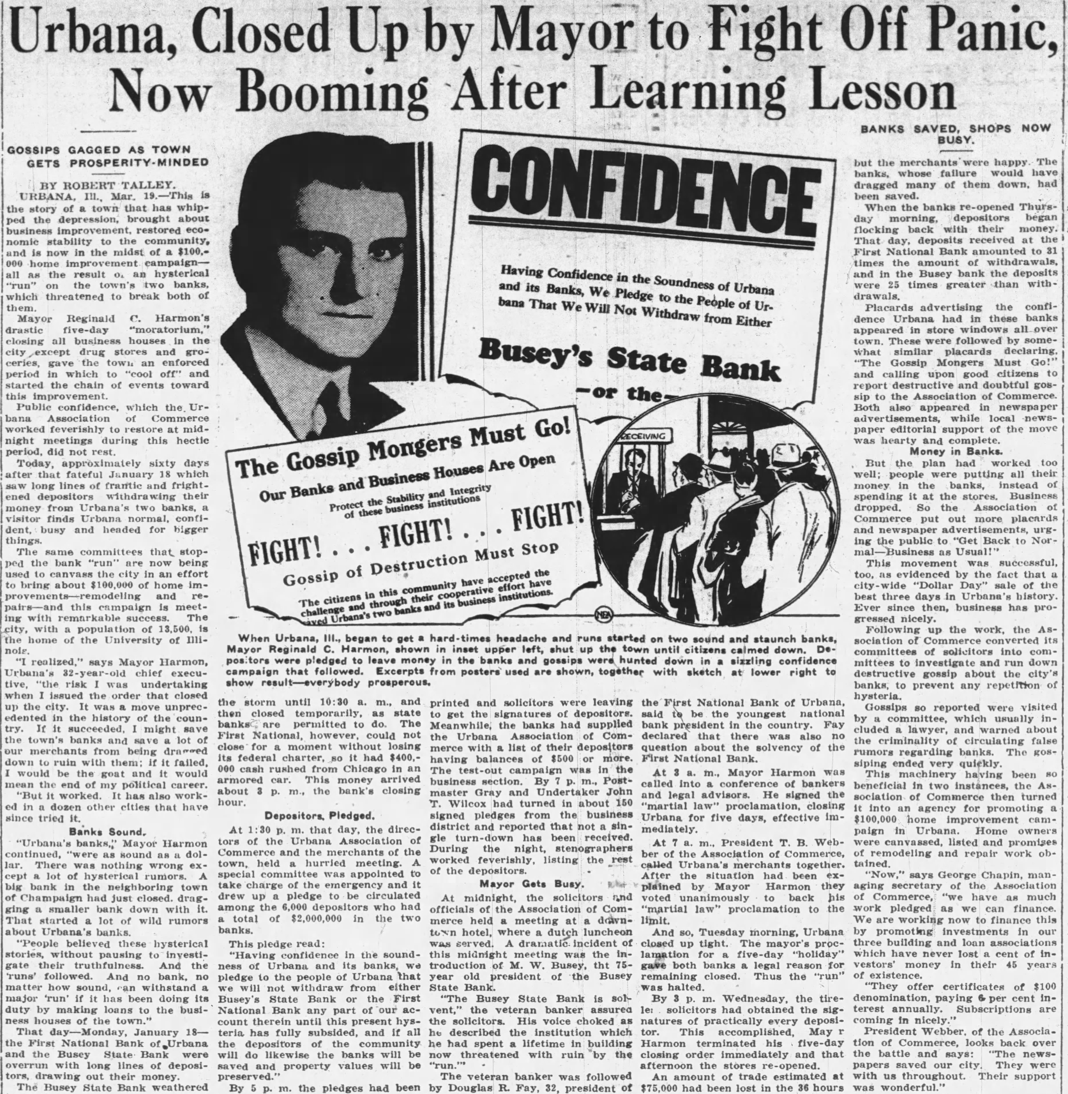 Mayor Gets Busy At midnight, the solicitors and of ficials of the Association of Commerce held meeting at a downtown hotel, where dutch luncheon was served A dramatic incident of this midnight meeting was the introduction of M. W. Busey, the 75-year-old president of the Busey State Bank. "The Busey State Bank is solvent,' the veteran banker assured the solicitors. His voice choked as he described the institution which he had spent a lifetime in building. now threatened with ruin by the "run." The veteran banker was followed by Douglas R. Fay, 32, president of the First National Bank of Urbana, said to be the youngest national bank president in the country. Fay declared that there also no question about the solvency of the First National Bank.. At m., Mayor Harmon was called into conference of bankers and their legal advisors He signed the "martial law" proclamation, closing Urbana for five days, effective immediately. At 7 m., President T. B. Webber of the Association of Commerce, called Urbana's merchants together. After the situation had been explained by Mayor Harmon they voted unanimously to back his "martial law" proclamation to the limit And so, Tuesday morning, Urbana closed up tight The mayor's proclamation for five-day "holiday" gave both banks a legal reason for 3-17-24-31 remaining closed. Thus, the "run" was halted. Stores Again Open By p. m. Wednesday, the tireless solicitors had obtained the signatures of practically every depositor. This accomplished, Mayor Harmon terminated his five-day closing order immediately and that afternoon the stores reopened. An amount of trade estimated at $75,000 had been lost in the 36 hours, but the merchants were happy. The banks, whose failure would have dragged many of them down, had been saved. When the banks reoponed Thursday morning, depositors began flocking back with their money. That day, deposits received at the First National Bank amounted to 31 times the amount of withdrawals, and in the Busey Bank the deposits were 25 times greater than withdrawals. Placards advertising the confidence Urbana had in these banks appeared in store windows all over town. These were followed by somewhat similar placards declaring "The Gossip Mongers Must Go!" and calling upon good citizens to report destructive and doubtful gossip to the Association of Commerce. Both also appeared in newspaper advertisements, while local newspaper editorial support of the move was hearty and complete.