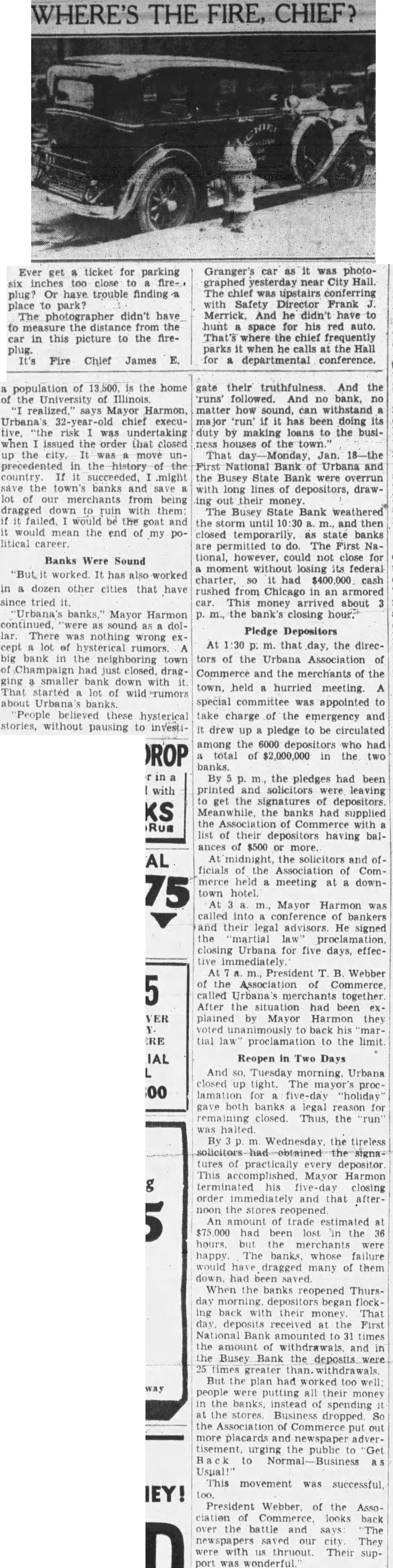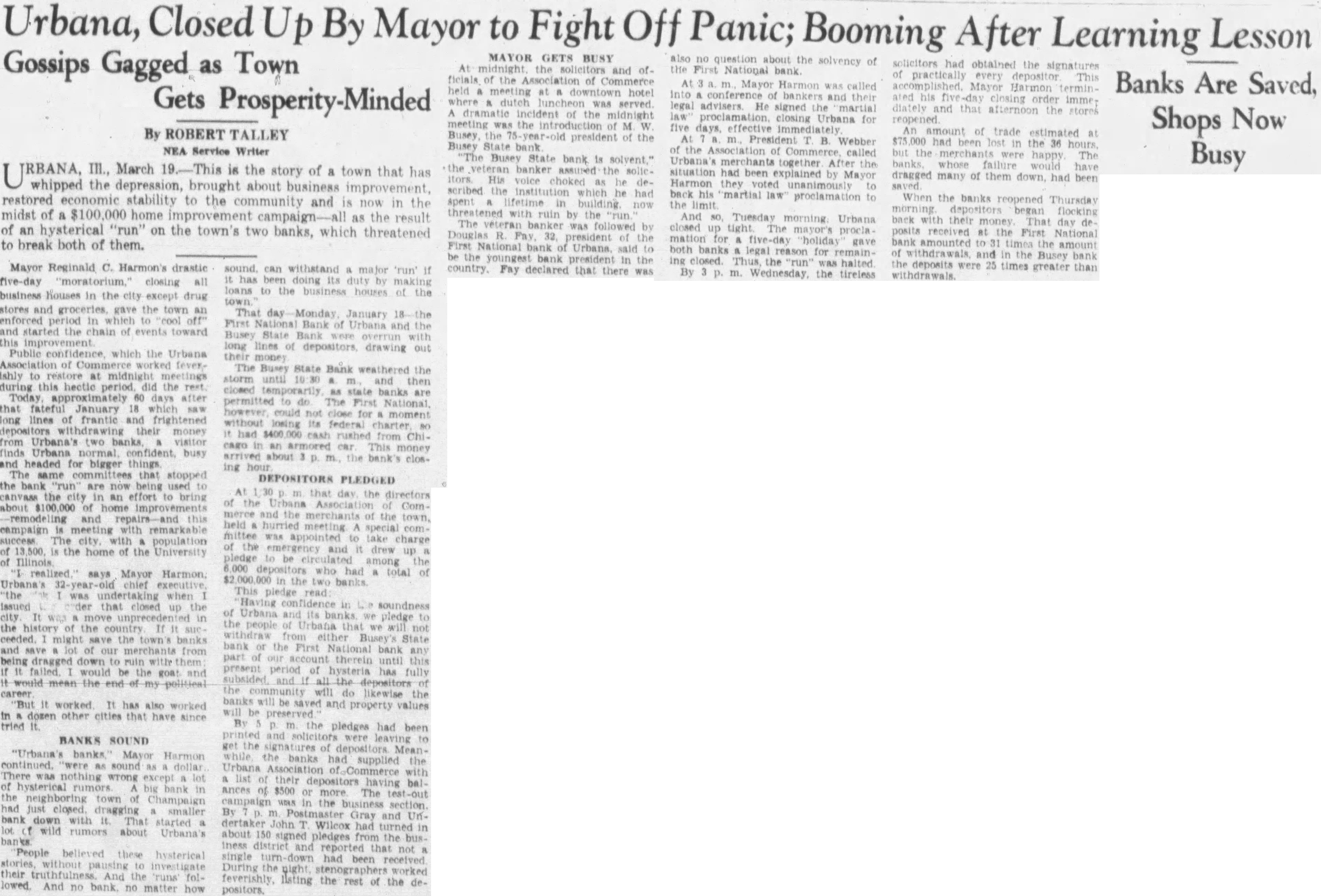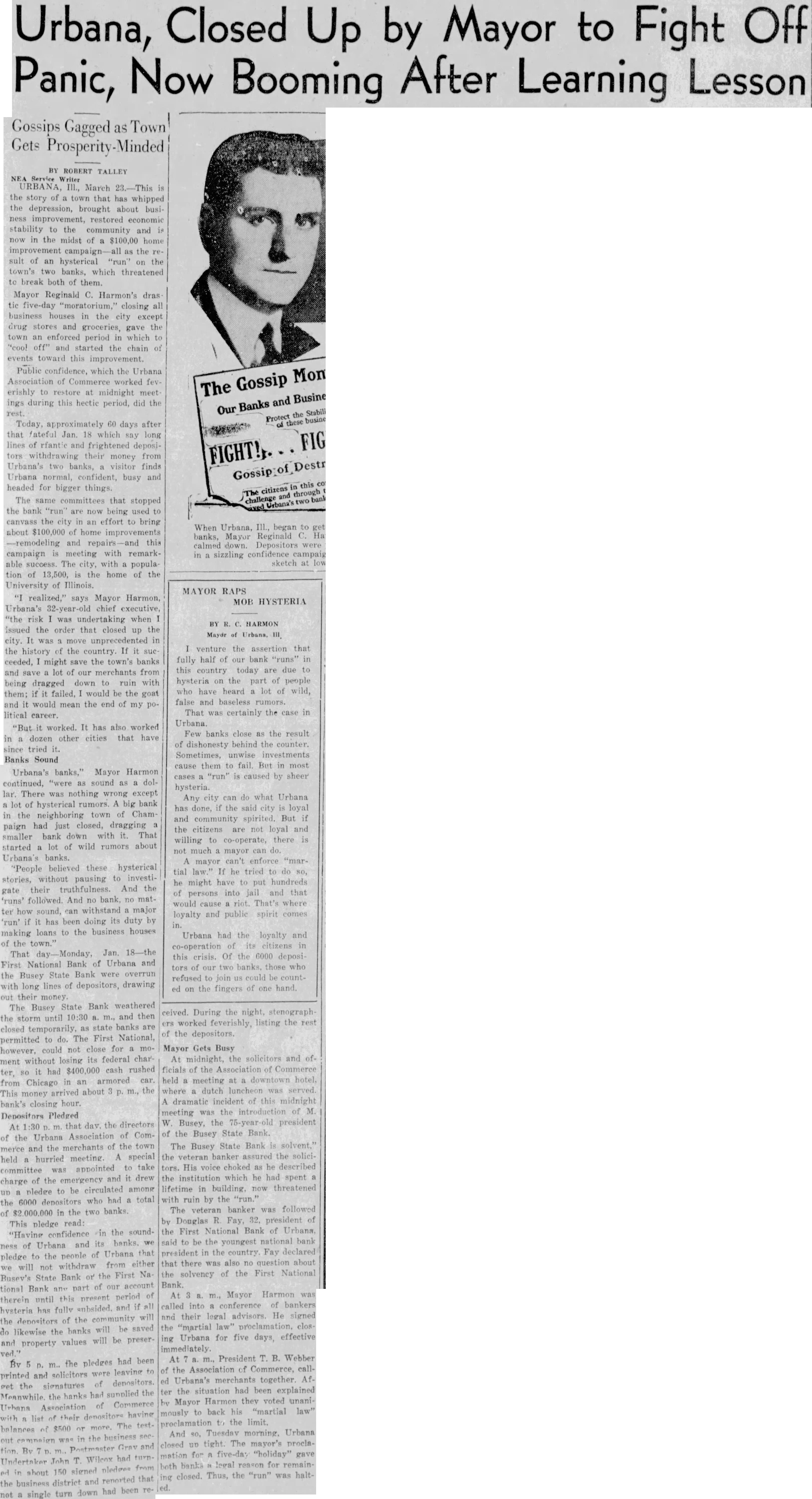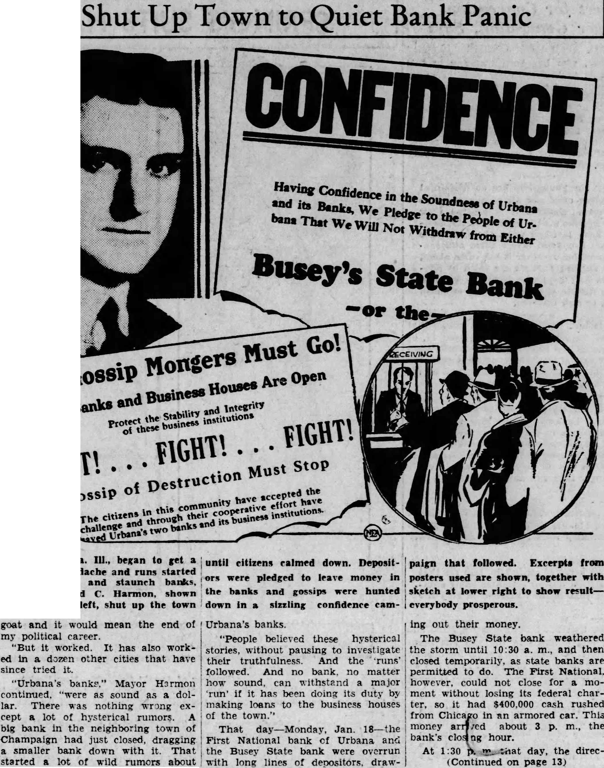 Mayor Gets Busy At midnight, the solicitors and of ficials of the Association of Commerce held meeting at a downtown hotel, where dutch luncheon was served A dramatic incident of this midnight meeting was the introduction of M. W. Busey, the 75-year-old president of the Busey State Bank. "The Busey State Bank is solvent,' the veteran banker assured the solicitors. His voice choked as he described the institution which he had spent a lifetime in building. now threatened with ruin by the "run." The veteran banker was followed by Douglas R. Fay, 32, president of the First National Bank of Urbana, said to be the youngest national bank president in the country. Fay declared that there also no question about the solvency of the First National Bank.. At m., Mayor Harmon was called into conference of bankers and their legal advisors He signed the "martial law" proclamation, closing Urbana for five days, effective immediately. At 7 m., President T. B. Webber of the Association of Commerce, called Urbana's merchants together. After the situation had been explained by Mayor Harmon they voted unanimously to back his "martial law" proclamation to the limit And so, Tuesday morning, Urbana closed up tight The mayor's proclamation for five-day "holiday" gave both banks a legal reason for 3-17-24-31 remaining closed. Thus, the "run" was halted. Stores Again Open By p. m. Wednesday, the tireless solicitors had obtained the signatures of practically every depositor. This accomplished, Mayor Harmon terminated his five-day closing order immediately and that afternoon the stores reopened. An amount of trade estimated at $75,000 had been lost in the 36 hours, but the merchants were happy. The banks, whose failure would have dragged many of them down, had been saved. When the banks reoponed Thursday morning, depositors began flocking back with their money. That day, deposits received at the First National Bank amounted to 31 times the amount of withdrawals, and in the Busey Bank the deposits were 25 times greater than withdrawals. Placards advertising the confidence Urbana had in these banks appeared in store windows all over town. These were followed by somewhat similar placards declaring "The Gossip Mongers Must Go!" and calling upon good citizens to report destructive and doubtful gossip to the Association of Commerce. Both also appeared in newspaper advertisements, while local newspaper editorial support of the move was hearty and complete.