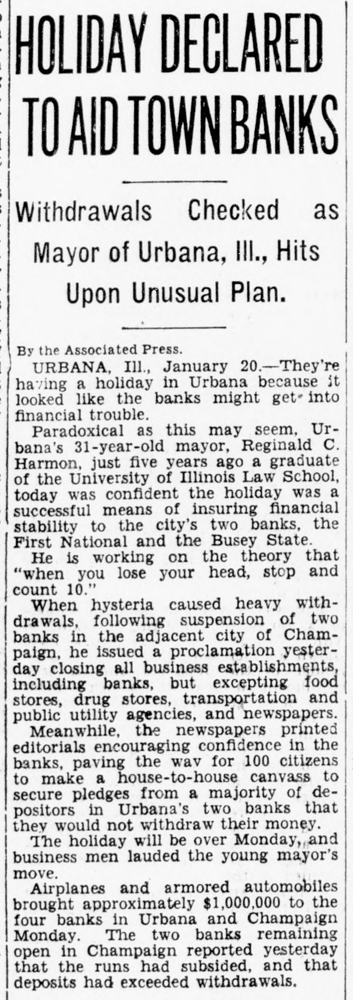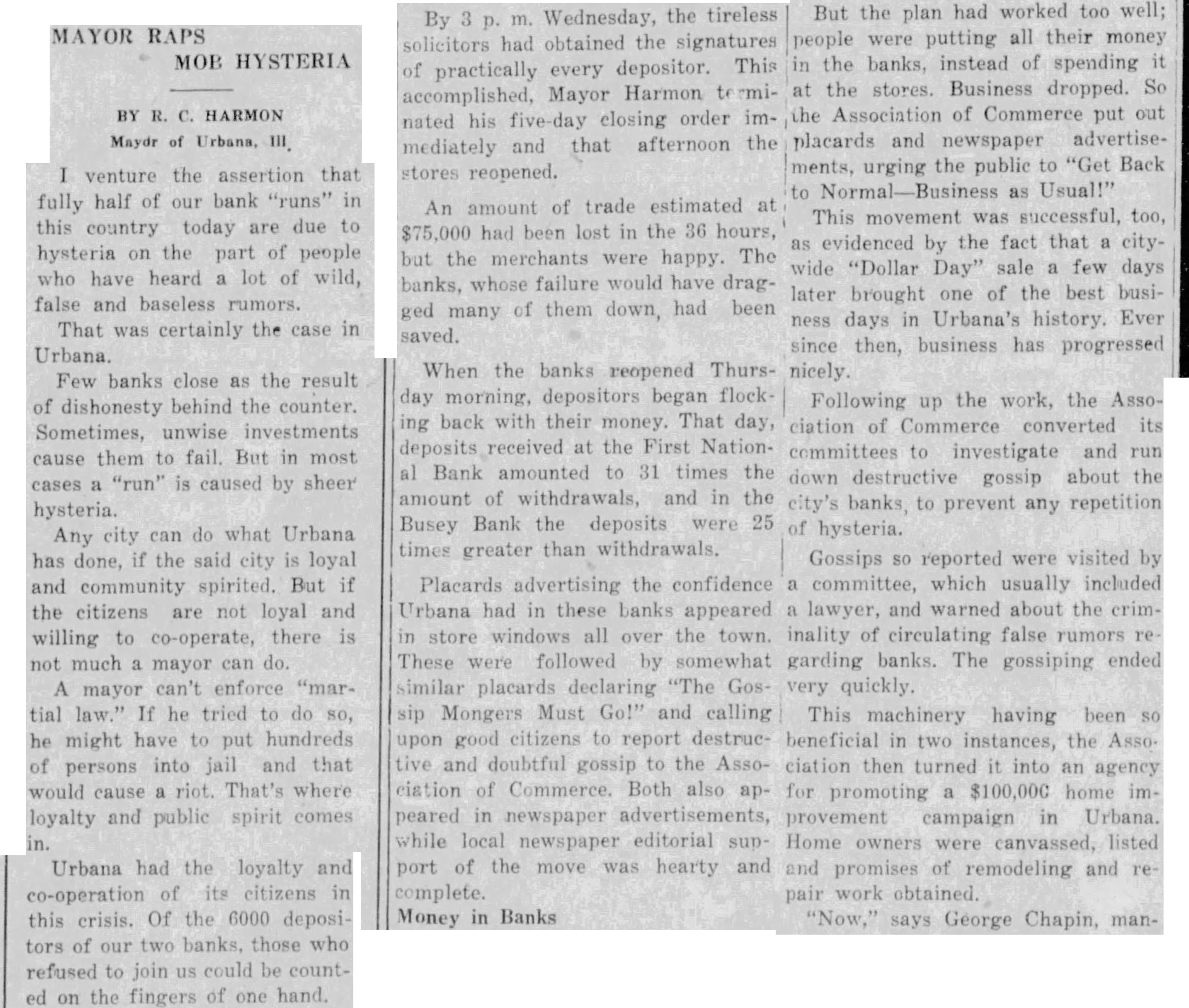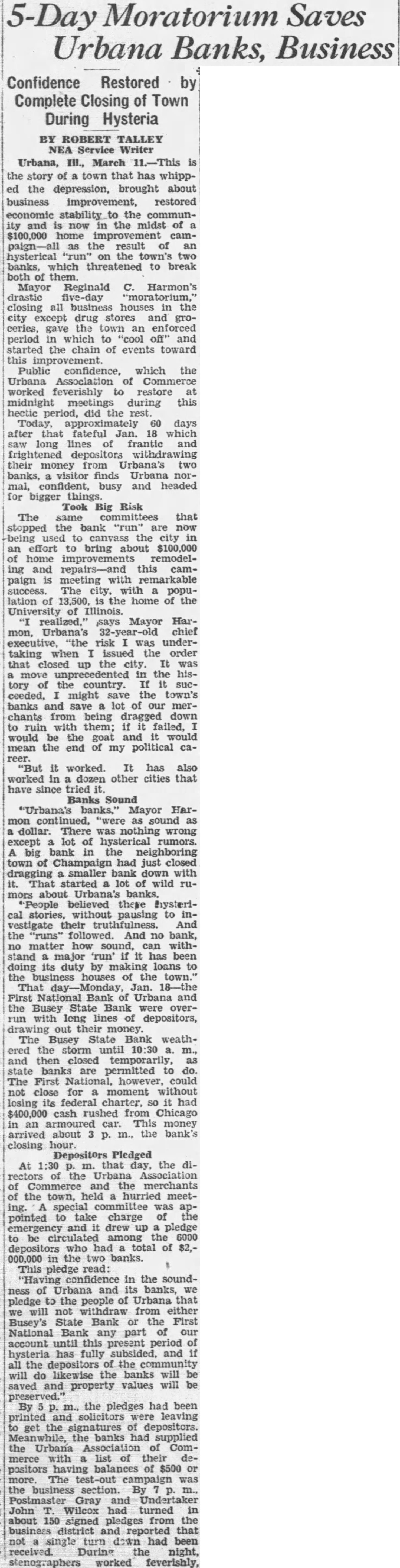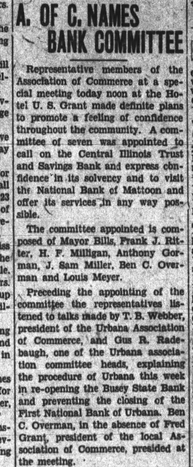 Mayor Gets Busy At midnight, the solicitors and of ficials of the Association of Commerce held meeting at a downtown hotel, where dutch luncheon was served A dramatic incident of this midnight meeting was the introduction of M. W. Busey, the 75-year-old president of the Busey State Bank. "The Busey State Bank is solvent,' the veteran banker assured the solicitors. His voice choked as he described the institution which he had spent a lifetime in building. now threatened with ruin by the "run." The veteran banker was followed by Douglas R. Fay, 32, president of the First National Bank of Urbana, said to be the youngest national bank president in the country. Fay declared that there also no question about the solvency of the First National Bank.. At m., Mayor Harmon was called into conference of bankers and their legal advisors He signed the "martial law" proclamation, closing Urbana for five days, effective immediately. At 7 m., President T. B. Webber of the Association of Commerce, called Urbana's merchants together. After the situation had been explained by Mayor Harmon they voted unanimously to back his "martial law" proclamation to the limit And so, Tuesday morning, Urbana closed up tight The mayor's proclamation for five-day "holiday" gave both banks a legal reason for 3-17-24-31 remaining closed. Thus, the "run" was halted. Stores Again Open By p. m. Wednesday, the tireless solicitors had obtained the signatures of practically every depositor. This accomplished, Mayor Harmon terminated his five-day closing order immediately and that afternoon the stores reopened. An amount of trade estimated at $75,000 had been lost in the 36 hours, but the merchants were happy. The banks, whose failure would have dragged many of them down, had been saved. When the banks reoponed Thursday morning, depositors began flocking back with their money. That day, deposits received at the First National Bank amounted to 31 times the amount of withdrawals, and in the Busey Bank the deposits were 25 times greater than withdrawals. Placards advertising the confidence Urbana had in these banks appeared in store windows all over town. These were followed by somewhat similar placards declaring "The Gossip Mongers Must Go!" and calling upon good citizens to report destructive and doubtful gossip to the Association of Commerce. Both also appeared in newspaper advertisements, while local newspaper editorial support of the move was hearty and complete.