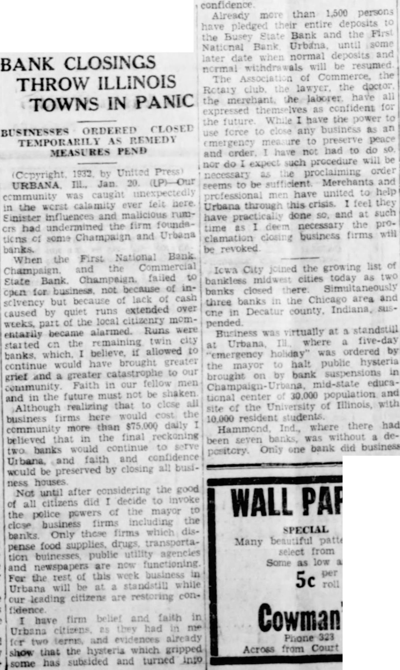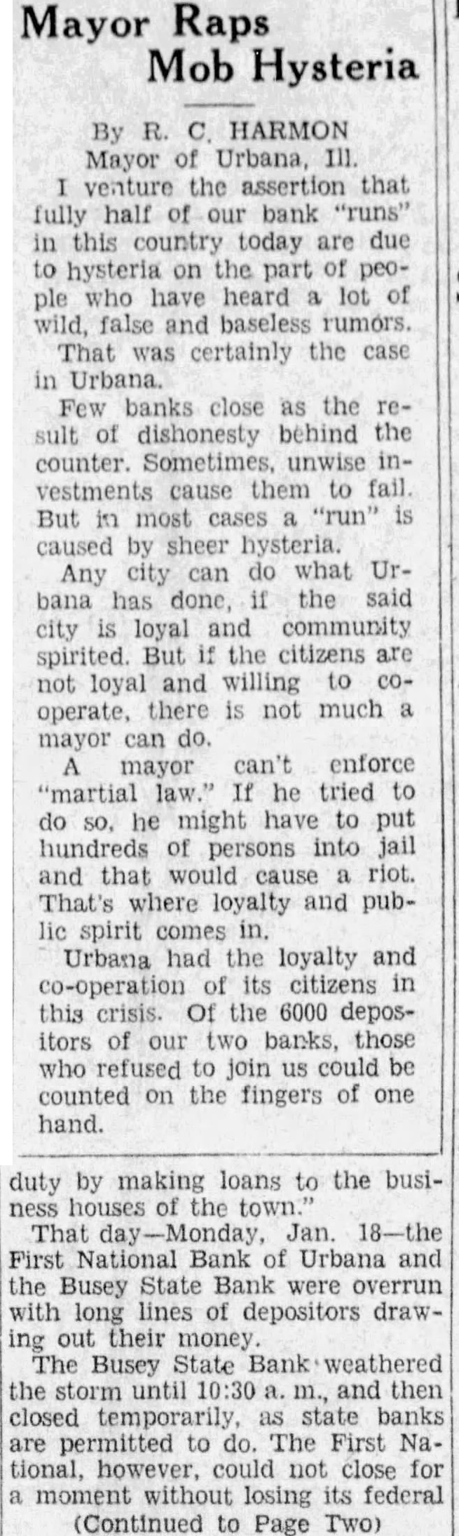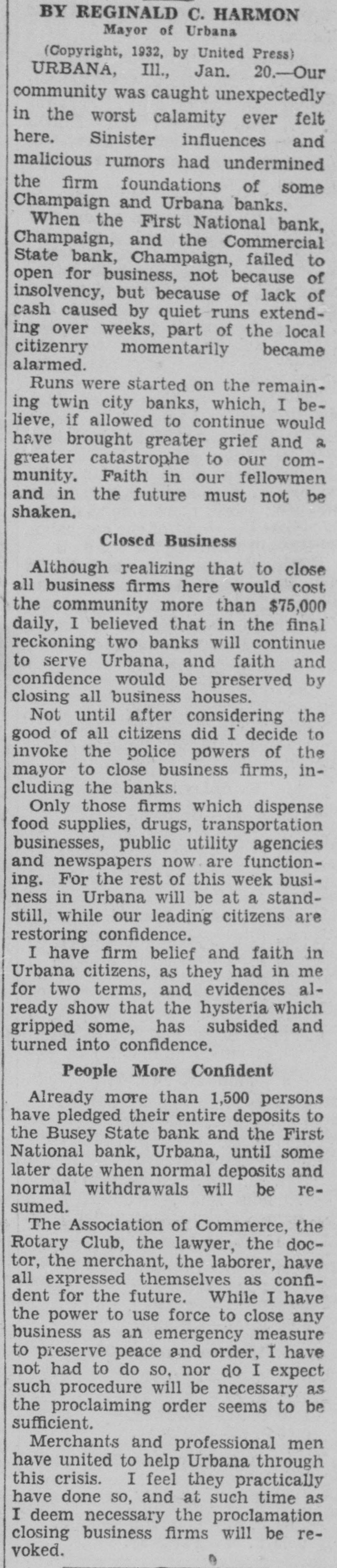 Banks Were Sound. "Urbana's banks", Mayor Harmon continued, "were as sound as dollar. There was nothing wrong except lot of hysterical rumors. A big bank in the neighboring town of Champaign had just closed, dragging smaller bank down with it. That started lot of wild rumors about Urbana's banks. "People believed these hysterical stories, without pausing investigate their truthfulness. And the 'runs' followed. And no bank, no matter how sound, can withstand a major 'run' if it has been doing its duty by making loans to the business houses of the town. That day-Monday, Jan. 18-the First National Bank of Urbana and the Busey States Bank were overrun with long lines of depositors, drawing out their money The Busey State Bank weathered the storm until 10:30 m. and then closed temporarily, as state banks are permitted to do The First National, however, could not close for moment without losing its federal charter, so it had $400,000 cash rushed from Chicago in an armored car. This money arrived about 3 p. m. the bank's closing hour Depositors Pledged At 1:30 m. that day, the directors of the Urbana Association of Commerce an the merchants of the town, held a hurried meeting. A special committee was appointed to take charge of the emergency and it drew up pledge to be circulated among the 6000 depositors who had a total of $2,000,000 in the two banks. This pledge read: "Having confidence in the soundness of Urbana and its banks, we pledge to the people of Urbana that we will not withdraw from either Busey's State Bank or the First Na. tional Bank any part of our account therein until this present period of hysteria has fully subsided, and if all the depositors of the community will do likewise the banks will be saved and property values will be preBy 5 m. the pledges had been printed and solicitors were leaving to get the signatures of depositors. Meanwhile, the banks had supplied the Urbana Association of Commerce with list of their depositors having balances of $500 or more. The testout campaign was in the business section. By 7 p. m. Postmaster Gray and Undertaker John T. Wilcox had turned in about 150 signed pledges from the business district and reported that not a single turn down had been received. During the night, stenographers worked feverishly, listing the rest of the depositors.