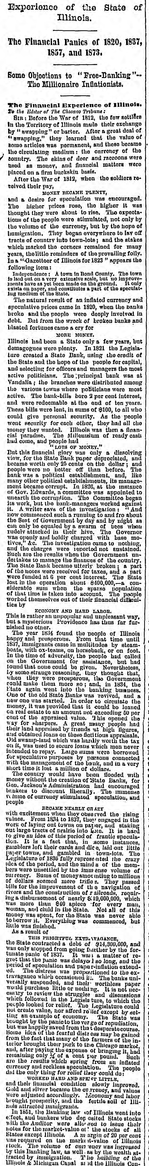 Experience of the State of Illinois. The Financial Panics of 1820, 1837, 1857, and IS73. Some Objoctions to Free-Danking The Millionaire Inflationists. The Financial Experience of Illinois. To the Editor of The Chicago Tribune Str: Before the War of 1812, the fow Bottlore in the Torritory of Illinois maile their exchange by 'swapplog" or barter. After a groat deal of " swapping," they learned that the value of somo articles WAB permanent, and those became the circulating medium the currency of the country. The skins of deor and raccoons were hood as money, and financial mattors were placed on a firm buckskin basis. After the War of 1812, when the soldiers rotelved their pay, MONEY BECAME PLENTY, and a desiro for speculation was encouraged. The higher prices roso, the higher it was thought they were about to rise. The expectatious of the people were stimulated, not only by the volume of the currency, but by the hope of Immigration. They began everywhere to lay off tracts of country into town-lote; and the stakes which marked the corners remained for many years, thelittle reminders of the provailing folly. In a "Gazottoer of Illinois for 1823 appears the following item Independence A town in Bond County. The town 19 laid out on a very extensive scale, but no improvements have as yet been made on the ground. It only exists on paper, and constitutes a part of the speculating modium of the State. The natural result of an inflated currency and speculative prices came in 1820, when the banks broke and the people were deoply involved in dobt. But from the wrock of broken banks and blasted fortunes came a cry for MORE MONEY. Illinois had been a State only B few years, but demagogues wore plenty. In 1821 the Legislaturo created a State Bank, using the credit of the State and the hope of the people for capital, and solocting for officers and managers the most active politicians. The (principal bank was at Vandalia the branches were distributed among the various towns where politicians wore most notive. The bank-bille boro 2 por cent interest, and were redoomable at the end of ton years. These bills were lont, in sums of $100, to all who could give personal security. As the people went security for each other, they had all the money they wanted. Illinois was thon & financial paradise. The Milleumium of ready cash Lad come, and people had LOTS OF MONEY." But this financial glory was only a dissolving view, for the State Bank paper depreciated, and became worth only 25 cents on the dollar; and people were no better off than before. The bank was a political establishment. and, like many other political establishments, its management became corrupt. In 1826, at the instauce of Gov. Edwards, n committee was appointed to unearth the corruption. The Committee began its work, but the bank-managers worked against it. A writer savs of the investigation " And now commenced such a running to and fro about the Sent of Government by day and by night as can only be equaled by a swarm of bees whom rudely attacked in their hive. The Governor was openly and boldly charged with base motives, &c. The investigation came to nothing, and the charges were reported not sustained. Such are the results when the Government undertakes to manage the finances of the country. The State Bank became uttorly broken a part of the notes wore received for taxes, and a part were funded at G per cent intorest. The State lost in the operation about $400,000, conelderable sum when the sparso population of that time is taken into account. The people worked themselves out of their financial difficultice by ECONOMY AND HARD LABOR. This is rather nn unpopular and unpleasant way, but a mysterious Providence has thus far furnislied no other. The year 1834 found the people of Illinois happy and prosperous. From that time until 1837, immigrants cabio in multitudes by steambonts, with ox-teame, on horseback, or on foot. In the time of adversity, the people had called on the Government for assistance, but had found that none could be given. Neverthetess, Ly somo strange reasoning, they thought that, when they were prosperous, the Government could make them more 80 and in 1834, the Etate again went into the banking business. a One of the old State Banks was revived, and new one was started. In order to circulate the money, it was provided that it could bo loaned on roal estate to an amount not exceeding 50 per cont of the appraised value. This opened the way for sharpers. A great many people had their land appraised by friends at bigh figures, and obtained loans on these tions appraisals. Old swamp-land which was hardly worth the tax on it, was used to secure loans which mon never intended to ropay. Large sums were borrowed for speculative purposes by persons connected with the management of the bank, and in a vory Bhort time it lost a million of dollars. The country would have beion flooded with money without the creation of State Banks, for Gon. Jackson's Administration had encouraged bankers to discount liborally. The immense n furne of currency stimulated speculation, and people DROAME NEARLY on AZY with excitement when they observed the rising values. From 1834 to 1837, they engaged in the work of laying out towns on patier, and staking out large tracts of prairio into Lots. It is hard to give an idea of this period of frantic speculation. It is a fact that, in some instances, gainblers loft their cards and dice, laid out little paper towns, and gambled in town-lots. The Legislature of 1836 fully represented the crazy idea of the period, and the mind 8 of the members wore unsettled by the imm enso volume of our rency. Sums of moneyamou mting to millions of dollars scemed more trifle 2. They passed bills for the improvement of th 0 navigation of rivers and the construction of r ailroads, requiring a disbursement of nearly $ 19,000,000, which Was more than 840 apieco for every man, woman, and child in the State. Not all of this money was spent, for