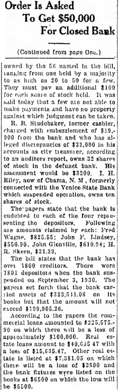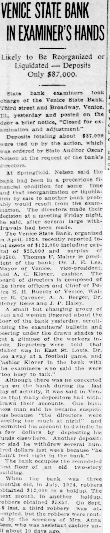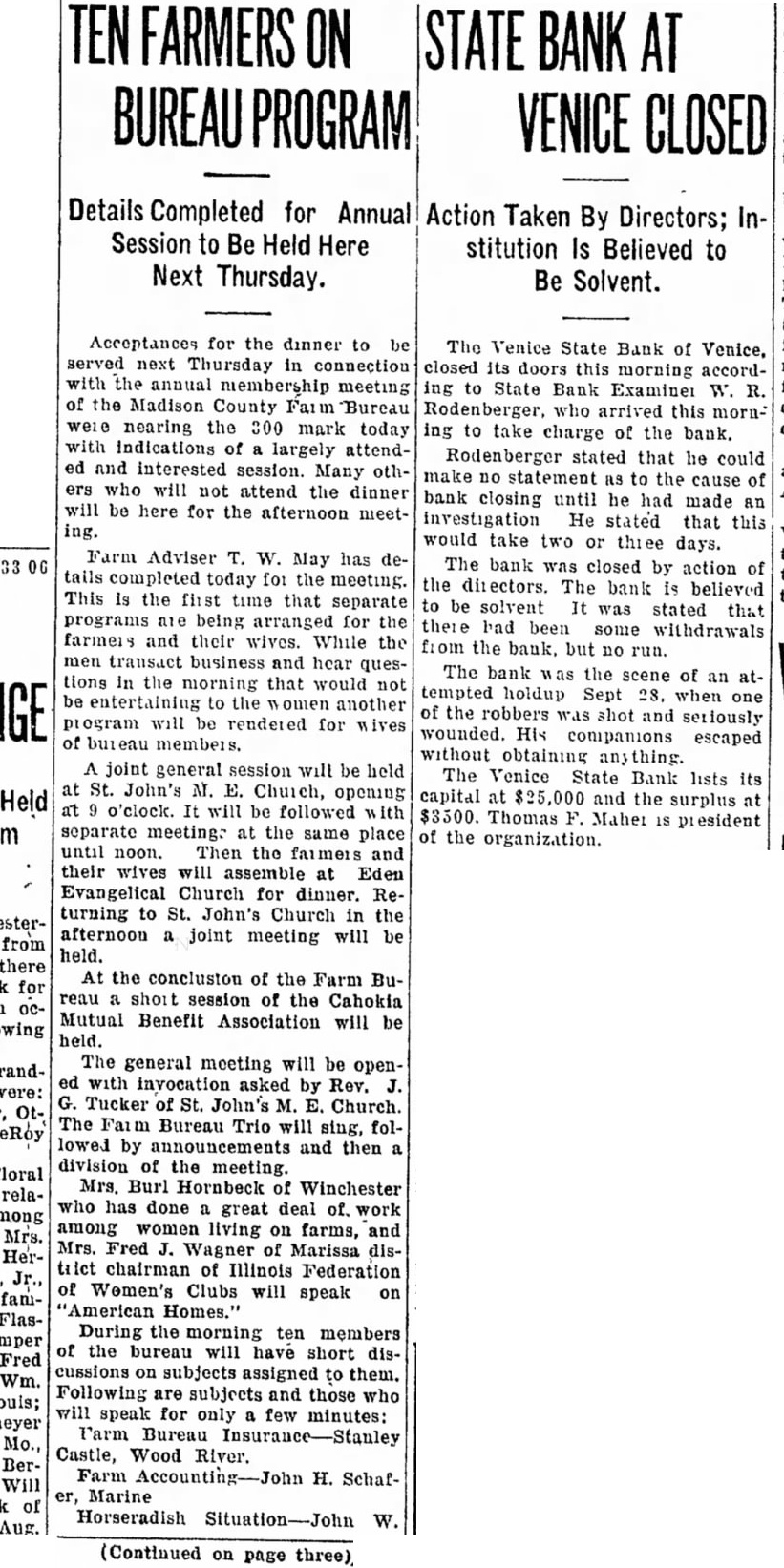 TEN FARMERS ON BUREAU PROGRAM STATE BANK AT VENICE CLOSED Details Completed for Annual Action Taken By Directors; InSession to Be Held Here stitution Is Believed to Next Thursday. Be Solvent. Acceptances for the dinner to be served next Thursday in connection with the annual membership meeting of the Madison County Farm Bureau were nearing the 300 mark today with indications of a largely attended and interested session. Many others who will not attend the dinner will be here for the afternoon meeting. Farm Adviser T. W. May has details completed today for the meeting. This is the first time that separate programs nie being arranged for the farmer and their wives. While the men transact business and hear questions in the morning that would not be entertaining to the women another program will be rendered for wives of bureau members. A joint general session will be held at St. John's M. E. Chuich, opening at 9 o'clock. It will be followed with separate meeting: at the same place until noon. Then the and their wives will assemble at Eden Evangelical Church for dinner. Returning to St. John's Church in the afternoon a joint meeting will be held. At the conclusion of the Farm Bureau a short session of the Cahokia Mutual Benefit Association will be held. The general meeting will be opened with invocation asked by Rev. J. G. Tucker of St. John's M. E. Church. The Farm Bureau Trio will sing, followed by announcements and then a division of the meeting. Mrs. Burl Hornbeck of Winchester who has done a great deal of. work among women living on farms, and Mrs. Fred J. Wagner of Marissa district chairman of Illinois Federation of Wemen's Clubs will speak on "American Homes." During the morning ten members of the bureau will have short discussions on subjects assigned to them. Following are subjects and those who will speak for only a few minutes: Farm Bureau Insurance-Stanley Castle, Wood River. Farm Accounting-John H. Schafer, Marine Horseradish Situation-John W. (Continued on page three). The Venice State Bank of Venice, closed its doors this morning according to State Bank Examiner W. R. Rodenberger, who arrived this morning to take charge of the bank. Rodenberger stated that he could make no statement RS to the cause of bank closing until he had made an investigation He stated that this would take two or three days. The bank was closed by action of the directors. The bank is believed to be solvent It was stated that there had been some withdrawals from the bank, but no run. The bank was the scene of an attempted holdup Sept 28, when one of the robbers was shot and seriously wounded. His companions escaped without obtaining thing. The Venice State Bank lists its capital at $25,000 and the surplus at $3500. Thomas F. Maher is president of the organization.