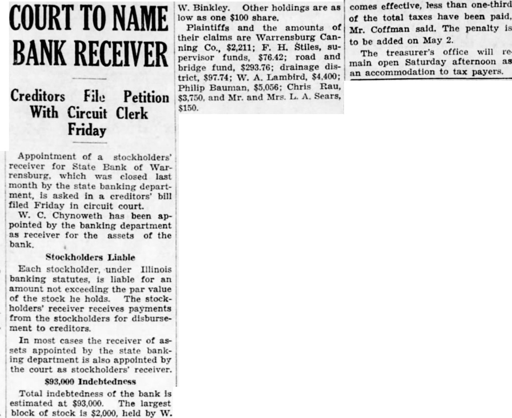 COURT TO NAME BANK RECEIVER Creditors File Petition With Circuit Clerk Friday Appointment of stockholders' receiver for State Bank of Warrensburg. which was closed last month by the state banking department, is asked in a creditors' bill filed Friday in circuit court. W. C. Chynoweth has been appointed by the banking department as receiver for the assets of the bank. Stockholders Liable Each stockholder, under Illinois banking statutes, is liable for an amount not exceeding the par value of the stock he holds. The stockholders' receiver receives payments from the stockholders for disbursement to creditors. In most cases the receiver of assets appointed by the state banking department is also appointed by the court as stockholders' receiver. $93,000 Indebtedness Total indebtedness of the bank is estimated at $93,000. The largest block of stock is $2,000, held by W. W. Binkley. Other holdings are as low as one $100 share. Plaintiffs and the amounts of their claims are Warrensburg Canning Co., $2,211; F. H. Stiles, supervisor funds, $76.42; road and bridge fund, $293.76; drainage district, $97.74; W. A. Lambird, $4,400; Philip Bauman, $5,056; Chris Rau, $3,750. and Mr. and Mrs. L. A. Sears, $150. comes effective, less than one-third of the total taxes have been paid, Mr. Coffman said. The penalty is to be added on May 2. The treasurer's office will remain open Saturday afternoon as an accommodation to tax payers.