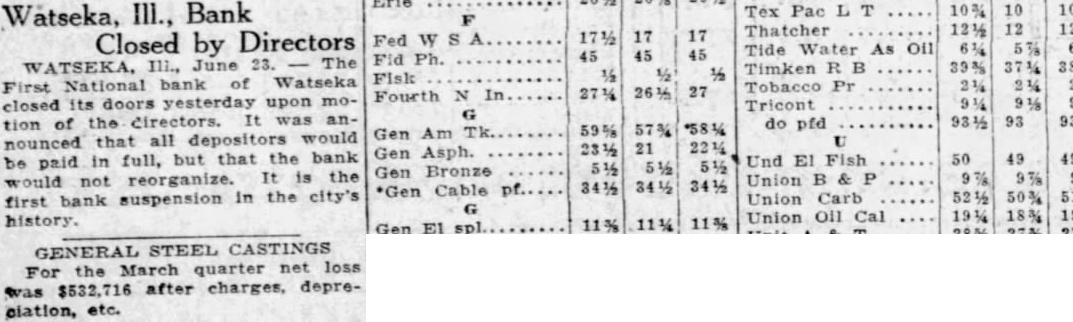 Watseka, III., Bank Thatcher 17 Closed by Directors Fed Tide Water As Oil WATSEKA, Timken National bank Watseka First Tobacco 27 Fourth closed its the pfd 93 57% would Gen all the bank Gen Asph. 49 full, that Und 50 49 Gen Bronze Union *Gen Cable suspension in the city's Union Carb first bank Union Cal history. 11% 11% GENERAL STEEL CASTINGS March quarter $532,716 after charges, depre-