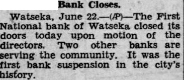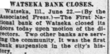 WATSEKA BANK CLOSES. Watseka, June the Associated First National bank of Watseka closed its doors today upon motion of the rectors. Two other banks the the first bank suspension the city's tory.