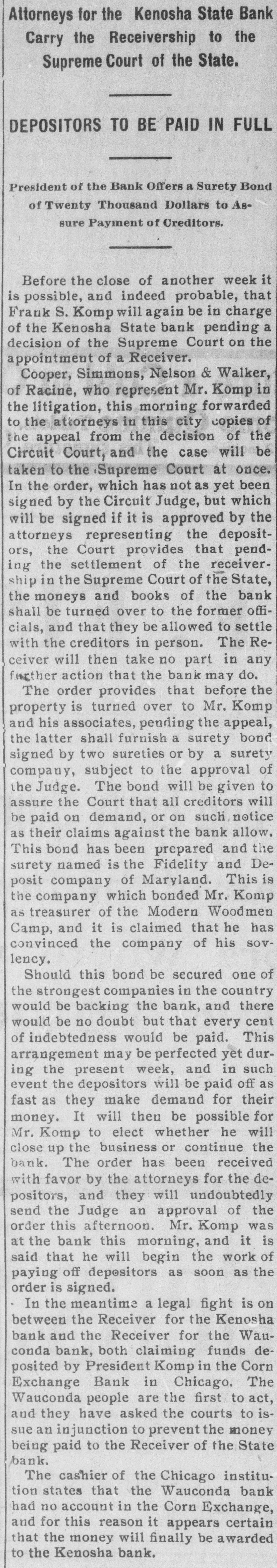 Attorneys for the Kenosha State Bank Carry the Receivership to the Supreme Court of the State. DEPOSITORS TO BE PAID IN FULL President of the Bank Offers a Surety Bond of Twenty Thousand Dollars to Assure Payment of Creditors. Before the close of another week it is possible, and indeed probable, that Frank S. Komp will again be in charge of the Kenosha State bank pending a decision of the Supreme Court on the appointment of a Receiver. Cooper, Simmons, Nelson & Walker, of Racine, who represent Mr. Komp in the litigation, this morning forwarded to the attorneys in this city copies of the appeal from the decision of the Circuit Court, and the case will be taken to the Supreme Court at once. In the order, which has not as yet been signed by the Circuit Judge, but which will be signed if it is approved by the attorneys representing the depositors, the Court provides that pending the settlement of the receivership in the Supreme Court of the State, the moneys and books of the bank shall be turned over to the former officials, and that they be allowed to settle with the creditors in person. The Receiver will then take no part in any further action that the bank may do. The order provides that before the property is turned over to Mr. Komp and his associates, pending the appeal, the latter shall furnish a surety bond signed by two sureties or by a surety company, subject to the approval of the Judge. The bond will be given to assure the Court that all creditors will be paid on demand, or on such, notice as their claims against the bank allow. This bond has been prepared and the surety named is the Fidelity and Deposit company of Maryland. This is the company which bonded Mr. Komp as treasurer of the Modern Woodmen Camp, and it is claimed that he has convinced the company of his sovlency. Should this bond be secured one of the strongest companies in the country would be backing the bank, and there would be no doubt but that every cent of indebtedness would be paid. This arrangement may be perfected yet during the present week, and in such event the depositors will be paid off as fast as they make demand for their money. It will then be possible for Mr. Komp to elect whether he will close up the business or continue the bank. The order has been received with favor by the attorneys for the depositors, and they will undoubtedly send the Judge an approval of the order this afternoon. Mr. Komp was at the bank this morning, and it is said that he will begin the work of paying off depositors as soon as the order is signed. In the meantime a legal fight is on between the Receiver for the Kenosha bank and the Receiver for the Wauconda bank, both claiming funds deposited by President Komp in the Corn Exchange Bank in Chicago. The Wauconda people are the first to act, and they have asked the courts to issue an injunction to prevent the money being paid to the Receiver of the State bank. The cashier of the Chicago institution states that the Wauconda bank had no account in the Corn Exchange, and for this reason it appears certain that the money will finally be awarded to the Kenosha bank.