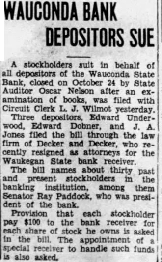 WAUCONDA stockholders suit in behalf of depositors of the Wauconda State Bank, closed on October by State Auditor Oscar Nelson after of books, filed Circuit Clerk Wilmot Three Underwood, Edward Dobner, and Jones filed the bill through the law firm Decker and Decker, cently resigned attorneys for the Waukegan State bank receiver. The about thirty past present stockholders the banking among them Senator Paddock, who presiof the bank. Provision that each stockholder $100 the bank receiver share stock asked The special such
