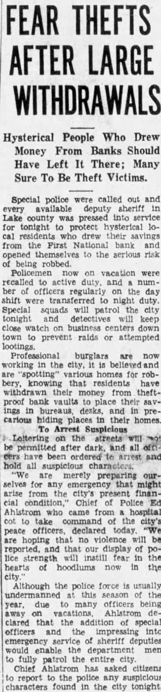 FEAR THEFTS AFTER LARGE WITHDRAWALS Hysterical People Who Drew Money From Banks Should Have Left It There; Many Sure To Be Theft Victims. Special police were called out and available deputy sheriff Lake county pressed into service for tonight to protect hysterical loresidents who drew their savings from the First National bank opened themselves to the serious risk being robbed. Policemen now on vacation were recalled to active duty. and number of officers regularly on the day shift were transferred to night duty. Special squads will patrol the city tonight and detectives will keep close watch on business centers down town to prevent raids or attempted lootings. Professional burglars are now working in the city, is believed 'spotting" homes for robbery, knowing that residents have withdrawn their money from theftproof bank vaults place their savings in bureaus, desks, and in precarious hiding places in their homes. Arrest Suspicious on the streets permitted after dark. and all cers have been to and hold all suspicious characters. merely preparing ourselves for any emergency that might arise from city's present financial Chief of Police Ed Ahlstrom who came from hospital take command of the city's peace officers, declared today. are hoping that no violence will be reported. that our display of lice strength will instill fear in hearts of hoodlums now in the city Although the police force is usually undermanned this season the due many officers being away on Ahlstrom declared that the addition of special officers and impressing emergency of sheriff deputies would enable department men to fully patrol the entire city. Chief Ahlstrom has asked citizens to report to the police any suspicious characters found in the city tonight.