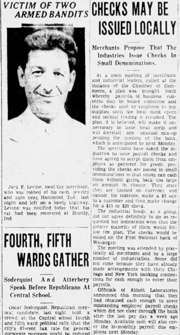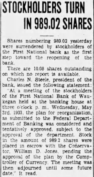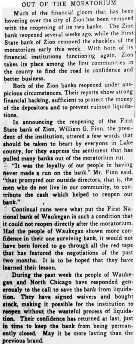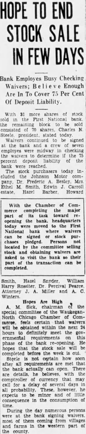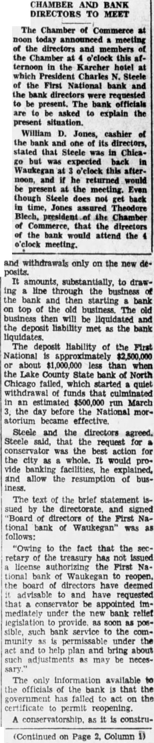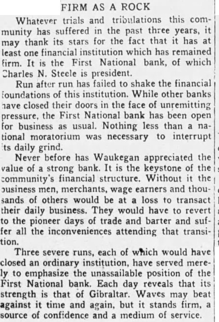 FIRM AS ROCK Whatever trials and tribulations this community has suffered in the past three years, may thank its stars for the fact that it has least one financial institution which has remained firm. is the First National bank, of which Charles Steele is president. Run run has failed to shake the financial foundations this institution. While other banks have closed their doors in the face of unremitting pressure, the First National bank has been open for business usual. Nothing less than national moratorium was necessary to interrupt ts daily grind. Never before has Waukegan appreciated the value of strong bank. the keystone of the community's financial structure. Without the business merchants, wage earners and thousands of others would be at loss to transact their daily business. They would have to revert to the days of trade and barter and suffer all the inconveniences attending that transition. Three severe runs, each of which would have closed ordinary institution, have served mereemphasize the unassailable position of the First National bank. Each day reveals that its strength that of Gibraltar. Waves may beat against time and again, but stands firm, source of confidence and medium of service.