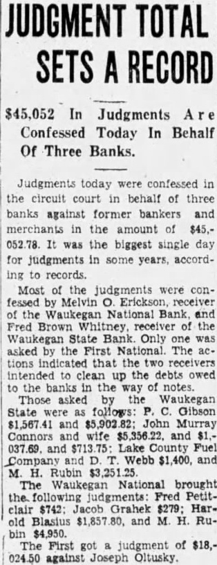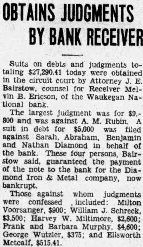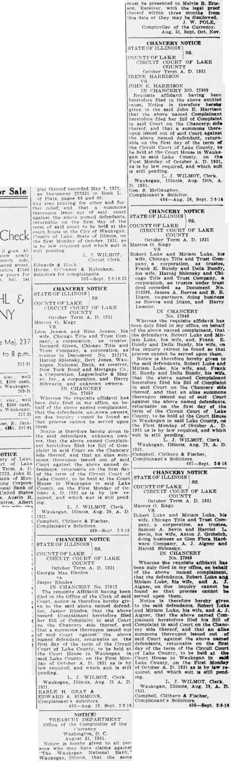 Leon Jensen Nina Jensen his wife, Title and Trust pany, trustee Bernard Given, Chicago Title and Trust trustee No. 312174. Harold Shiensky, Bert Jones, Waukegan National Bank. receiver, New York Bond and Mortgage corporation, Harry owners. IN CHANCERY 27050 Whereas the requisite affidavit has filed my office. on behalf named complainant, the due that process cannot be served upon Notice therefore hereby given to the said unknown the filed his Com plaint in said Court the Chancery side thereof, and that an alias thereupon issued out said Court against the named first the the Court County the Court House Waukegan said Lake County the First Monday 1931 by and which suit still pend WILMOT Clerk