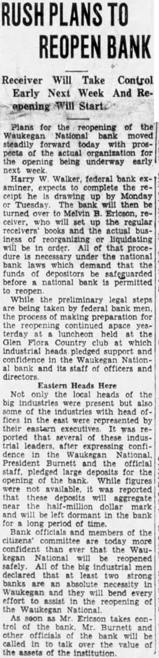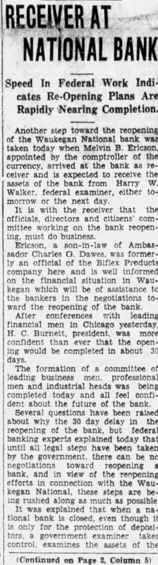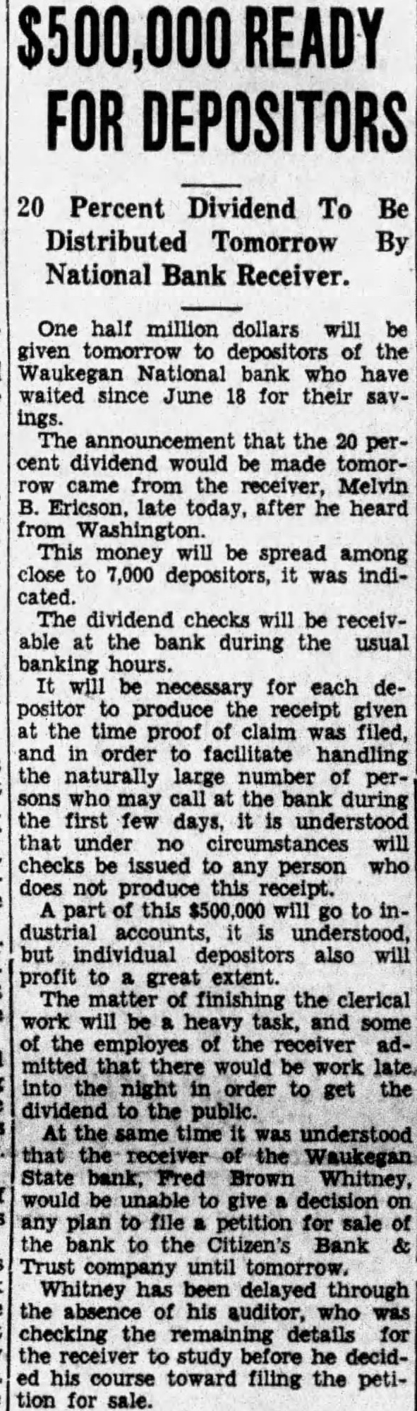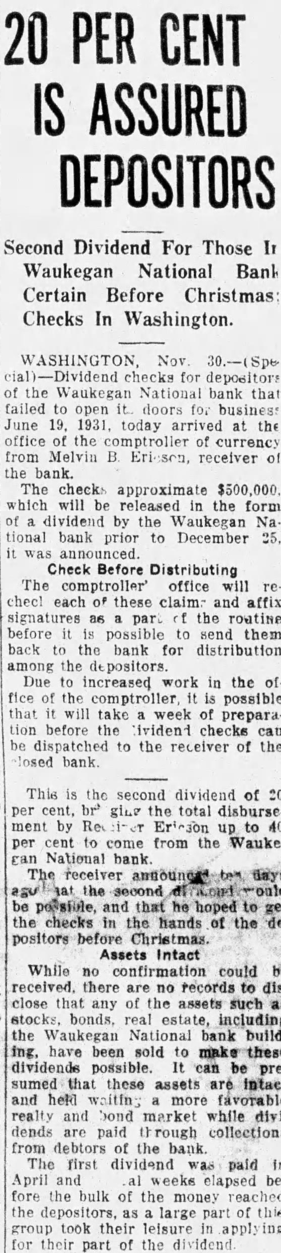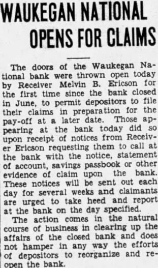 TREASURY of the Comptroller of the Office Currency Washington, August 1931. Notice is hereby given to all perclaims against National Waukegan, Illinois, that the same must presented to Melvin B. ErieReceiver, with the legal proof thereof within three months from this date or they may be disallowed. W. Comptroller the Currency. 31, Sept. Oct. Nov.