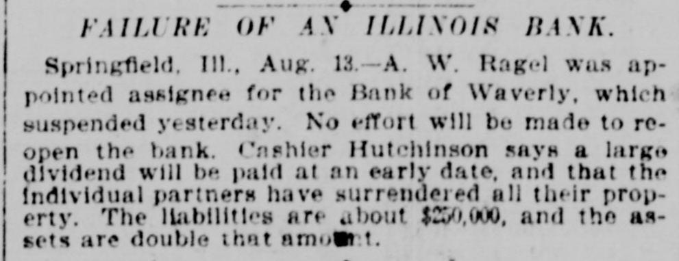 FAILURE OF AN ILLINOIS BANK. Springfield, III., Aug. 13.-A. W. Ragel was appointed assignee for the Bank of Waverly, which suspended yesterday. No effort will be made to reopen the bank. Cashier Hutchinson says a large dividend will be paid at an early date, and that the individual partners have surrendered all their property. The liabilities are about $250,000, and the assets are double that amount.